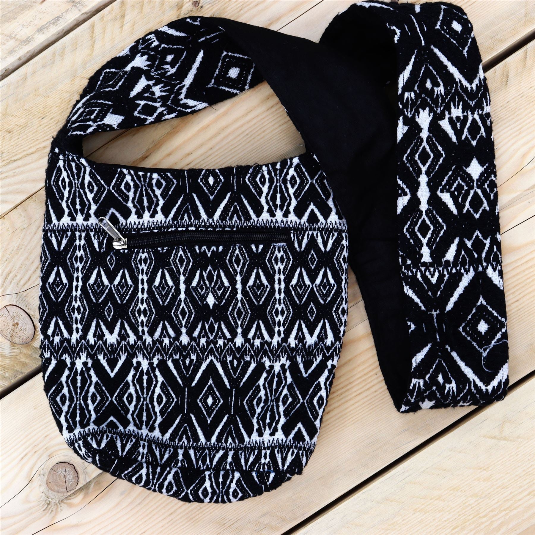 Handbag sized cotton canvas sling shoulder bag, handmade with a soft cotton lining, a main zipped section, and smaller pockets on both the inside and outside.