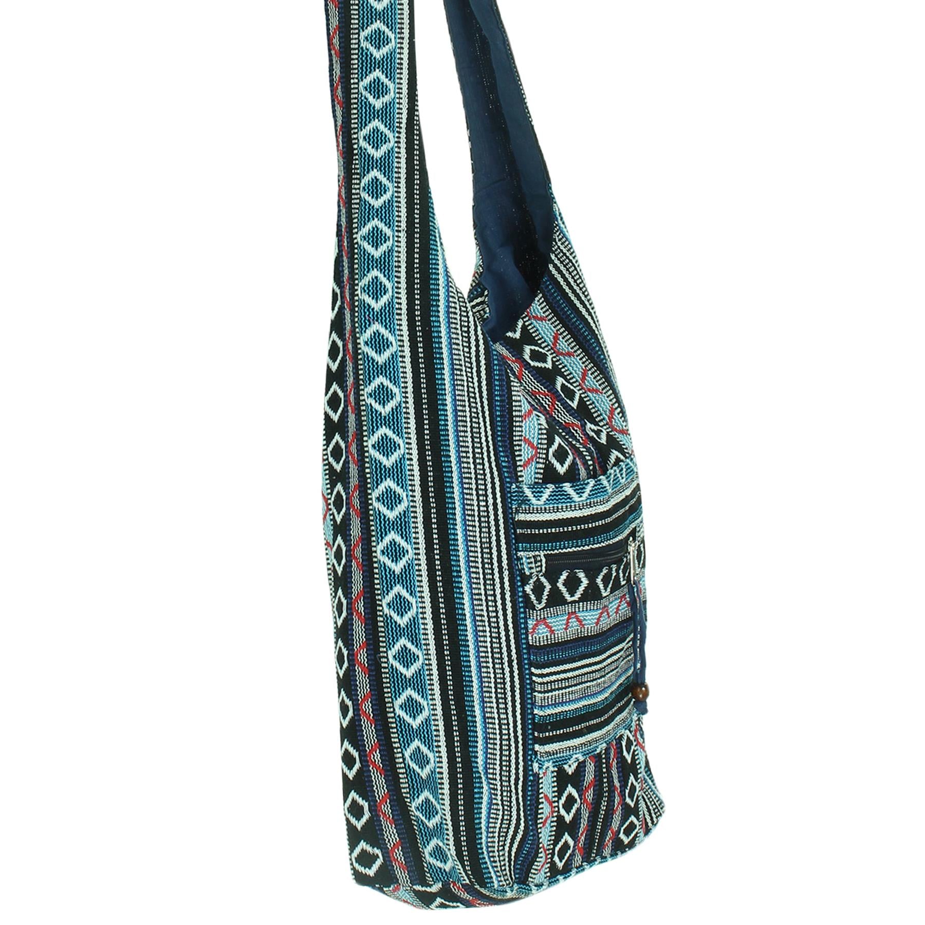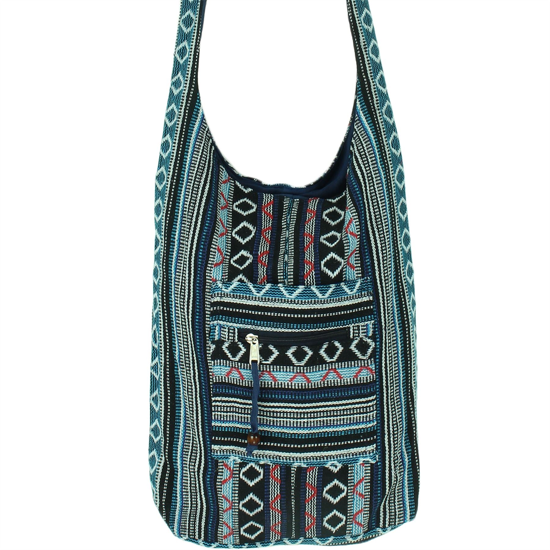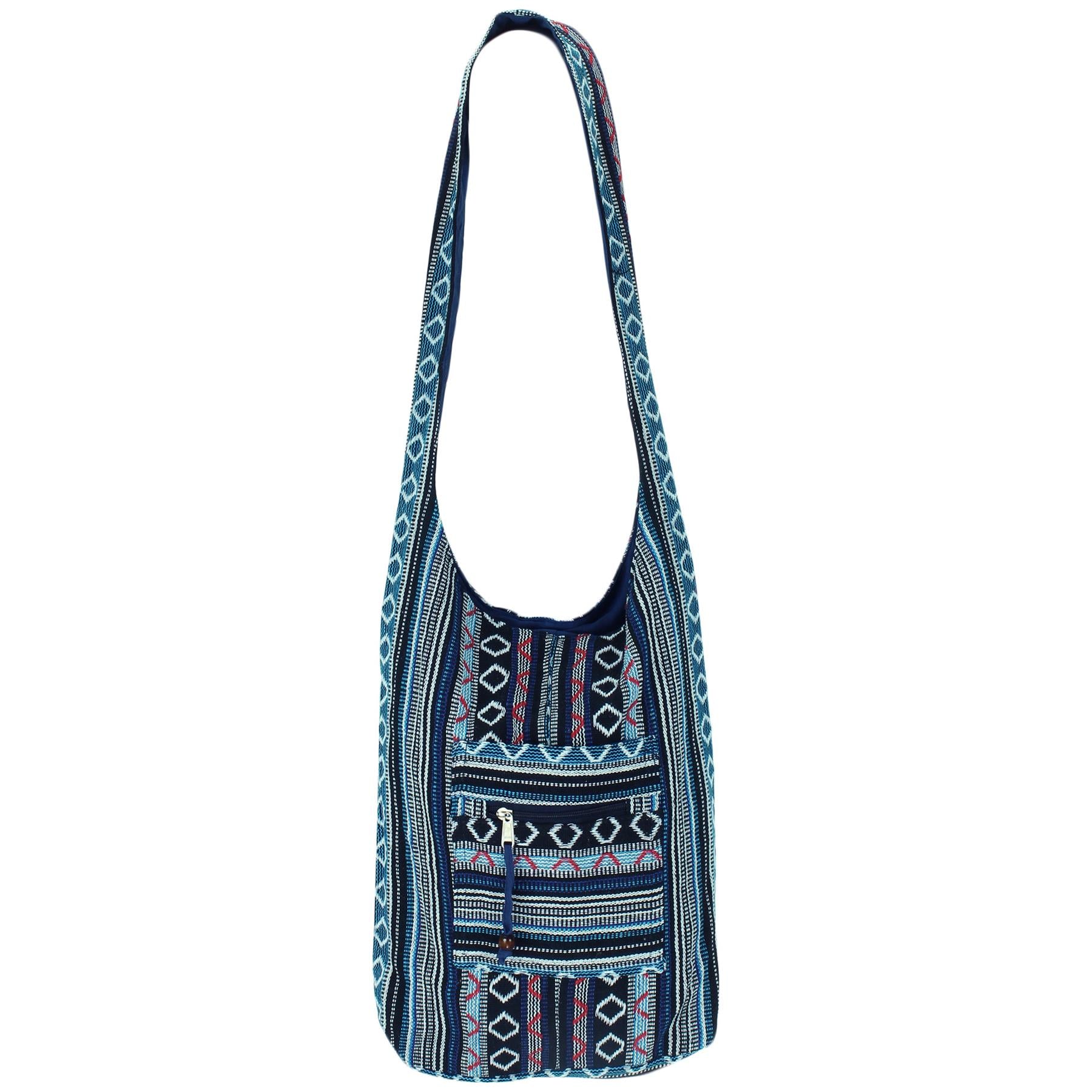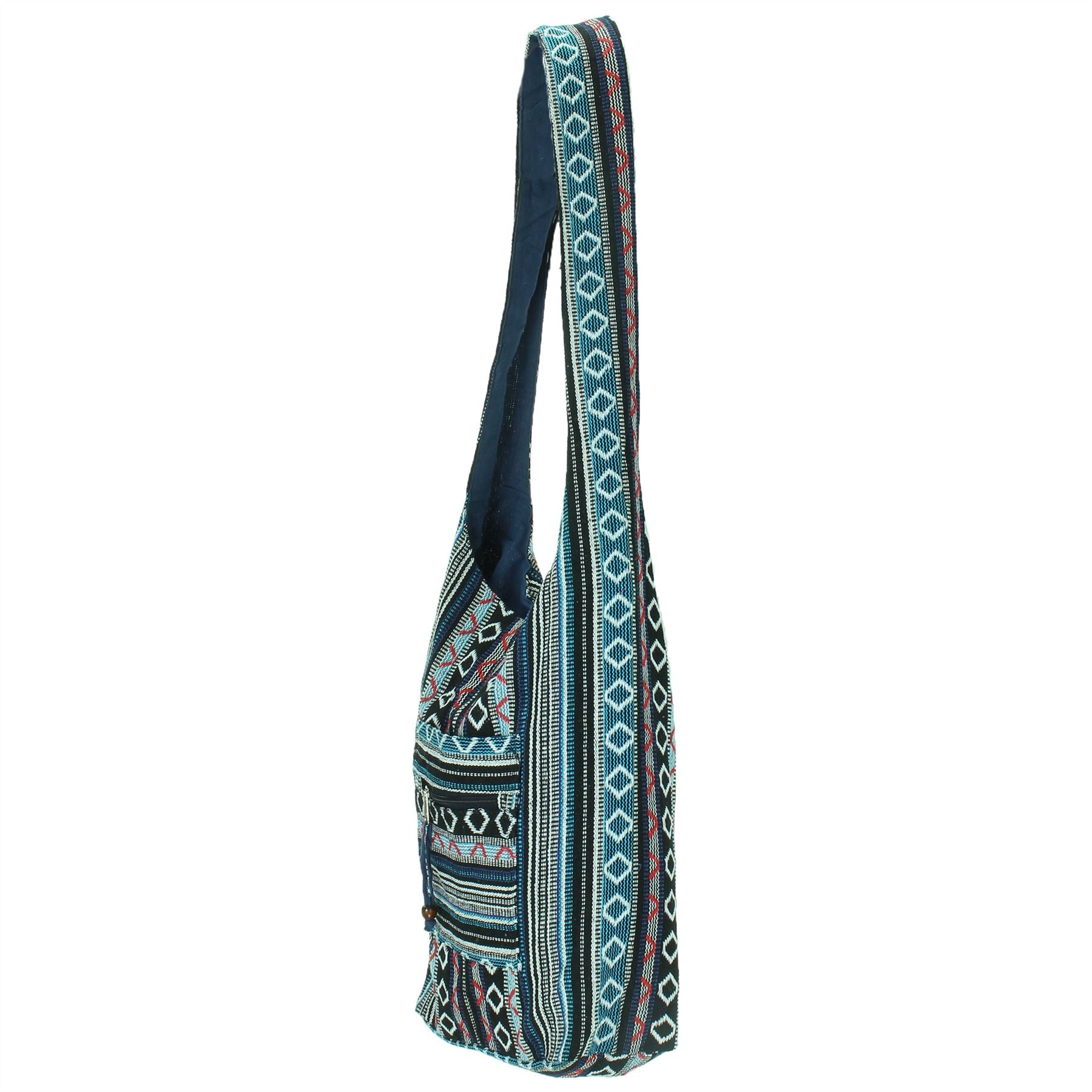 Cotton canvas sling shoulder bag featuring a cotton lining, main zipped pocket, internal zipped pocket and an external pocket comprising a zipped section and a patch pocket behind.