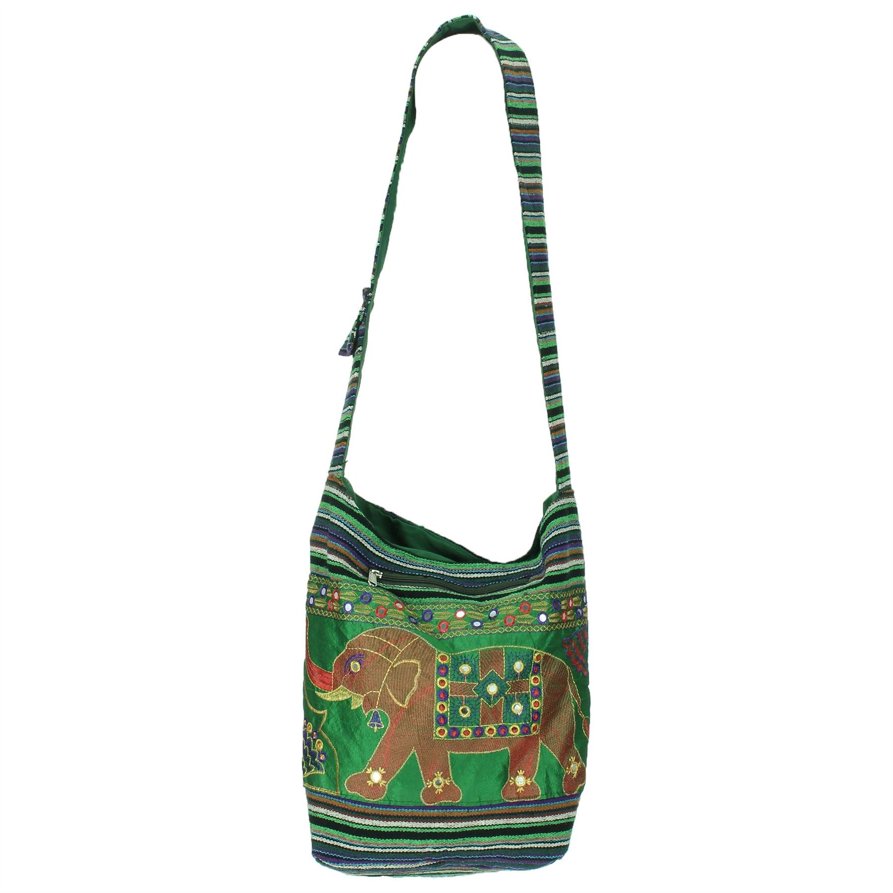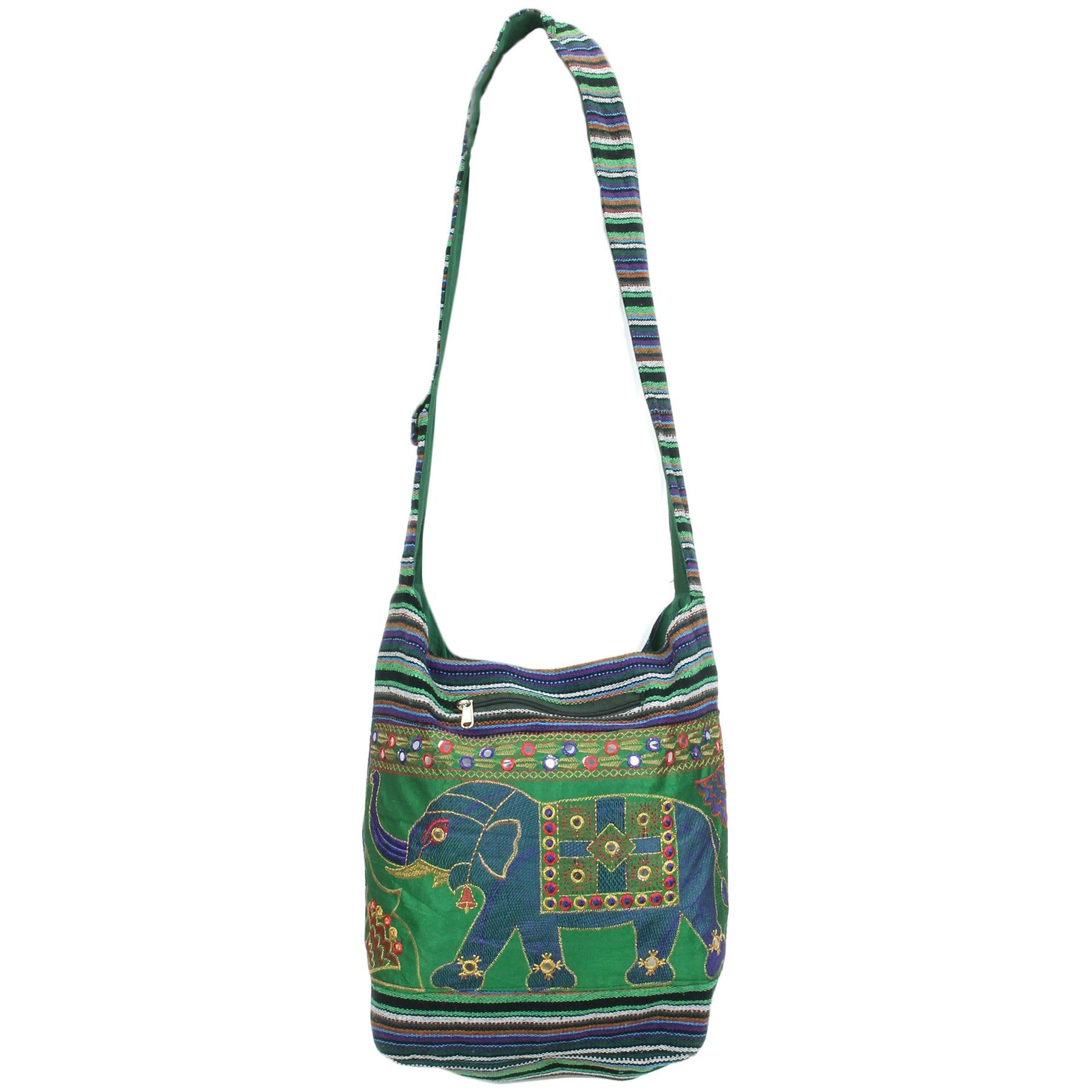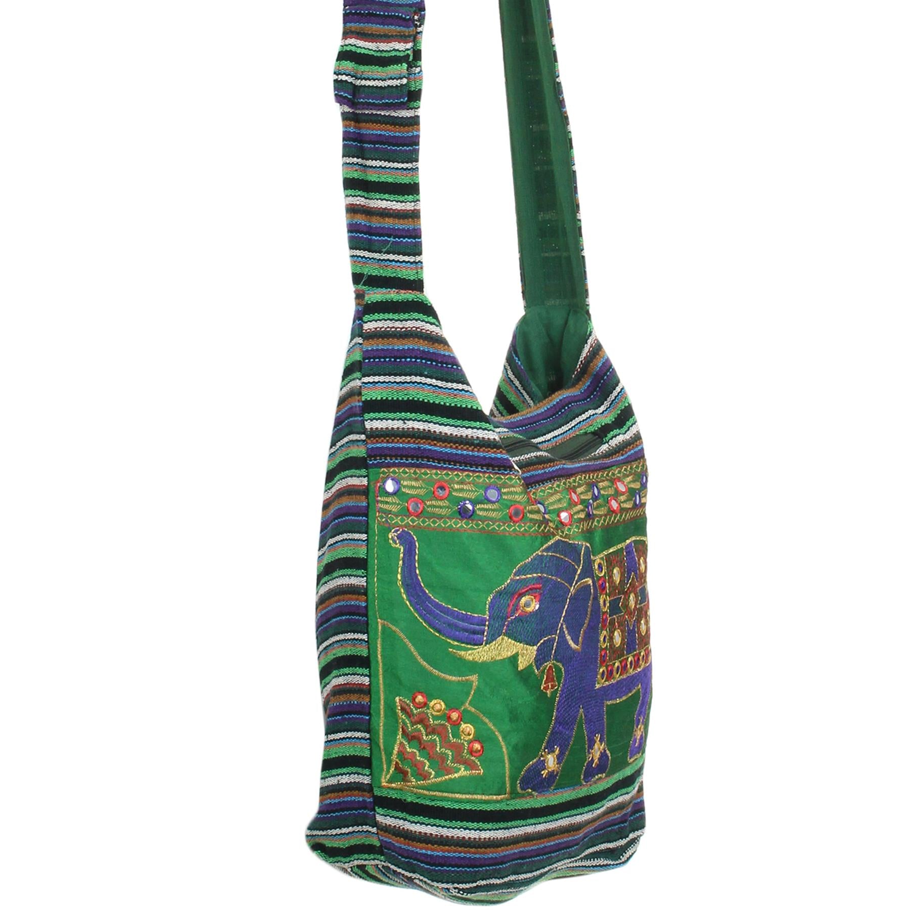 Embroidered Elephant Canvas Sling Shoulder Bag - Green Purple