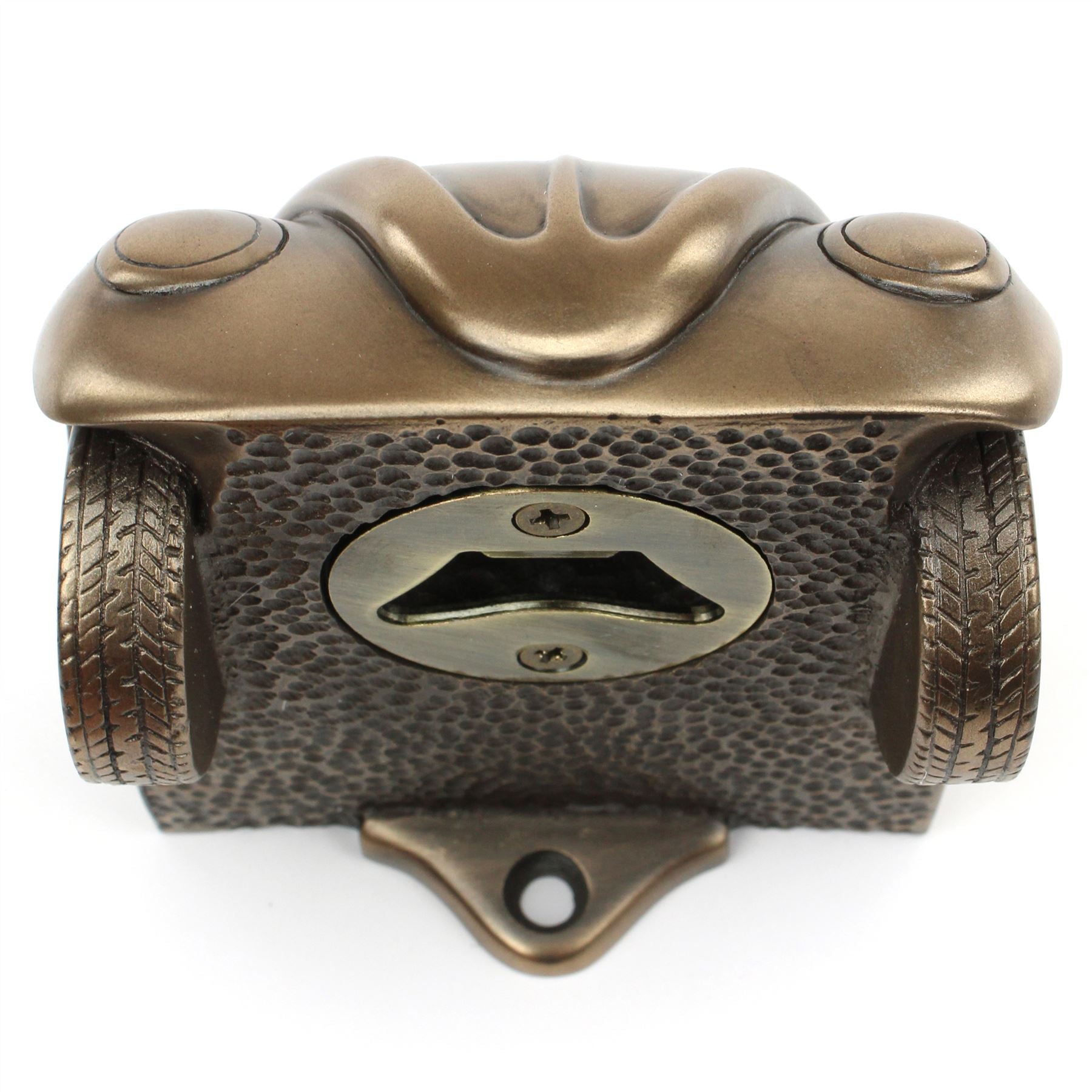 Cast from a durable resin with a choice of two metal finishes, bronze or silver with a stainless steel bottle opener.