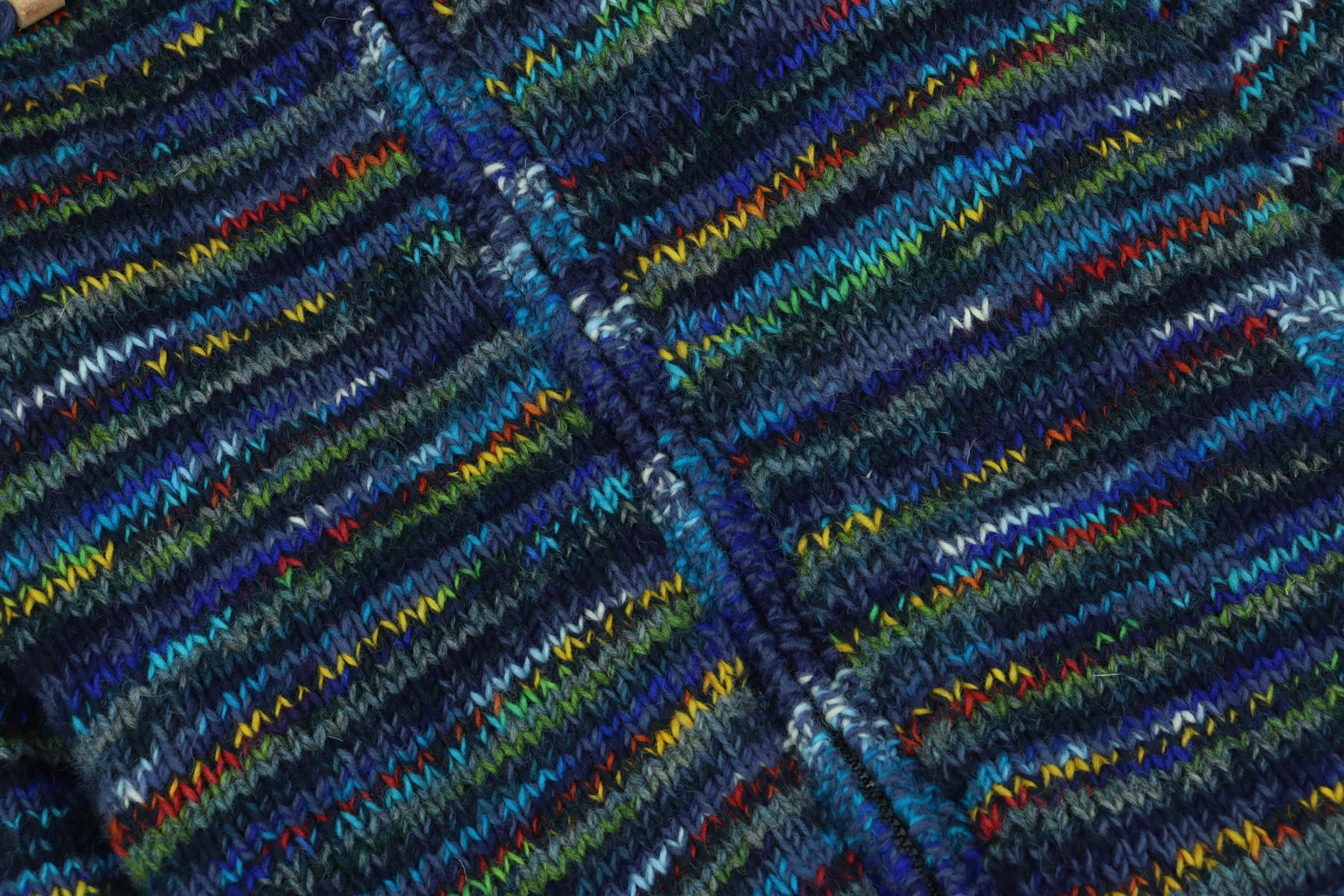 Handmade wool knit hooded zip jacket with a warm fleece lining, side pockets, inside pocket, and wooden neck toggles. A practical hoodie cardigan, great for laying up throughout the colder months and keeping warm around the fire during cool summer evenings.