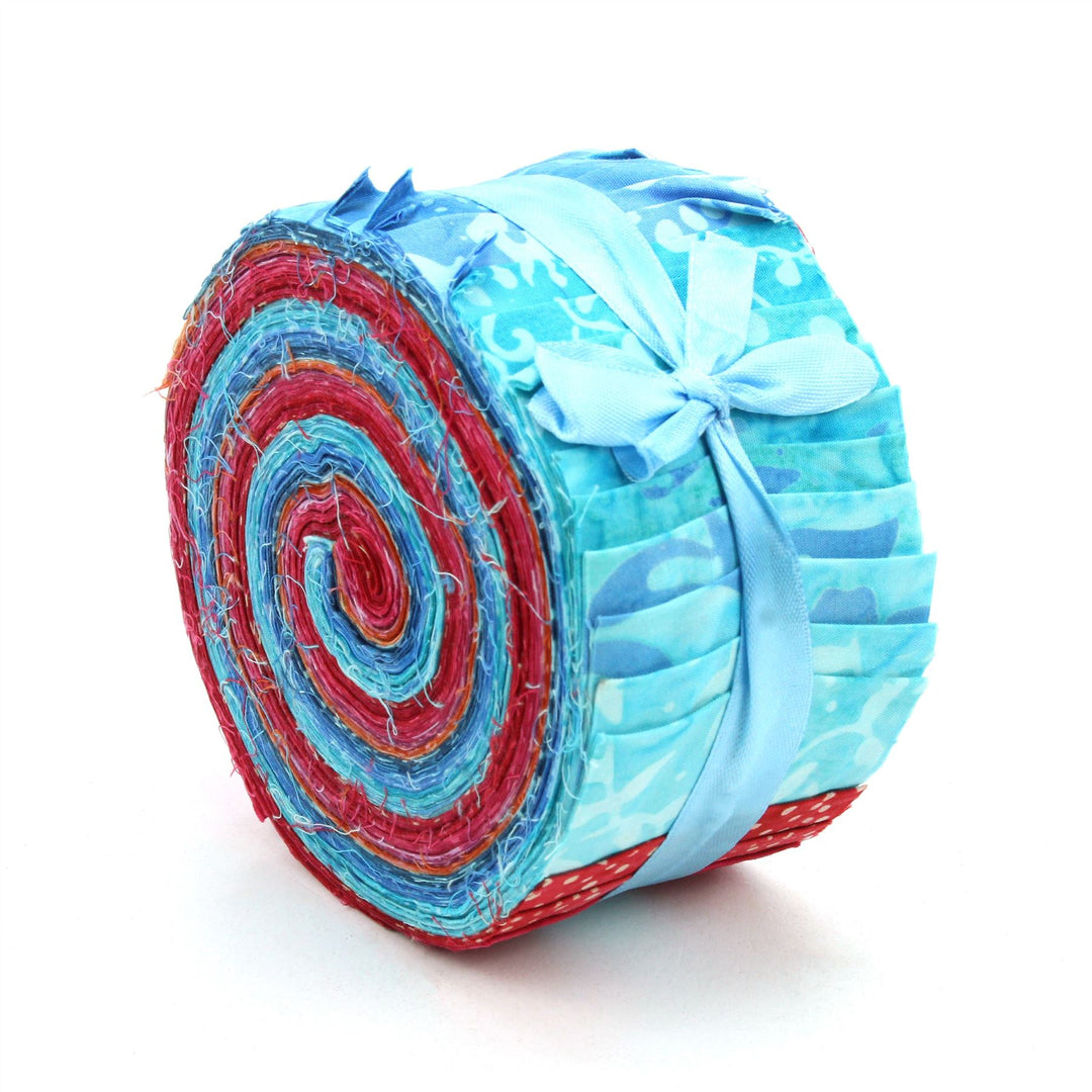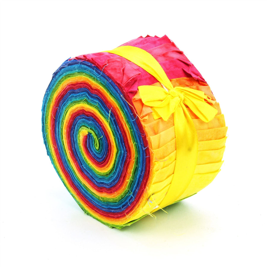 40 strips of 2.5" x 37" (approx.) cotton Batik fabric in a mix of prints and colours all bundled into an lovely little Jelly Roll.