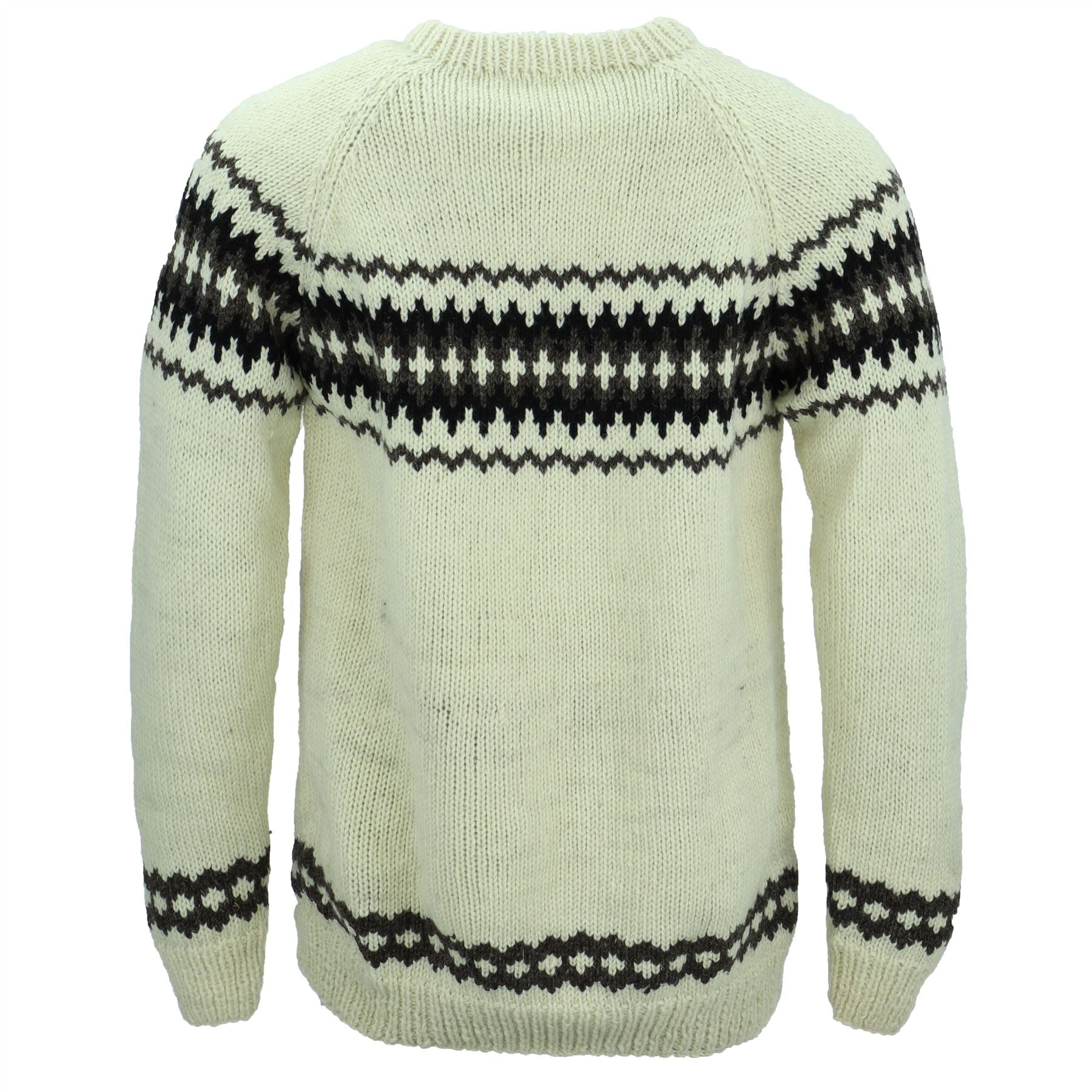 Comfortable and loose, hand-knitted wool jumpers featuring a crew neck, raglan sleeves, ribbed knit hem and cuffs and a traditional Nordic fairisle pattern. A lovely and cosy woolen pullover, perfect for layering up on cold days or just for lounging around the house.