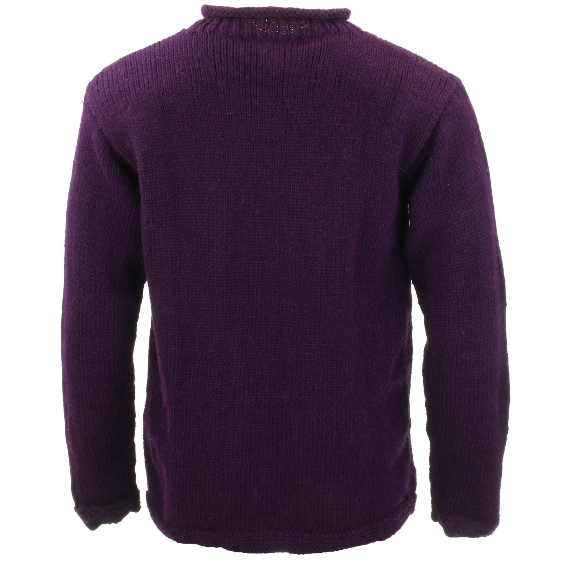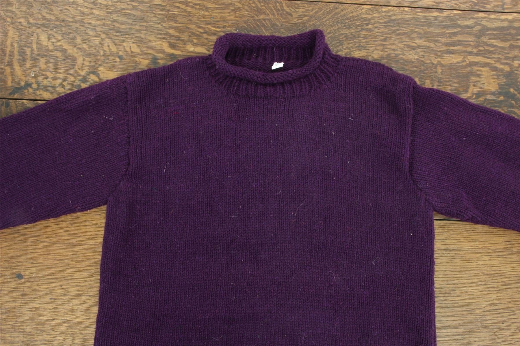 Comfortable and loose hand-knitted wool jumpers featuring a rolled crew neck and double knit hem and cuffs. A lovely and cosy woollen pullover, perfect for layering up on cold days or just for lounging around the house.