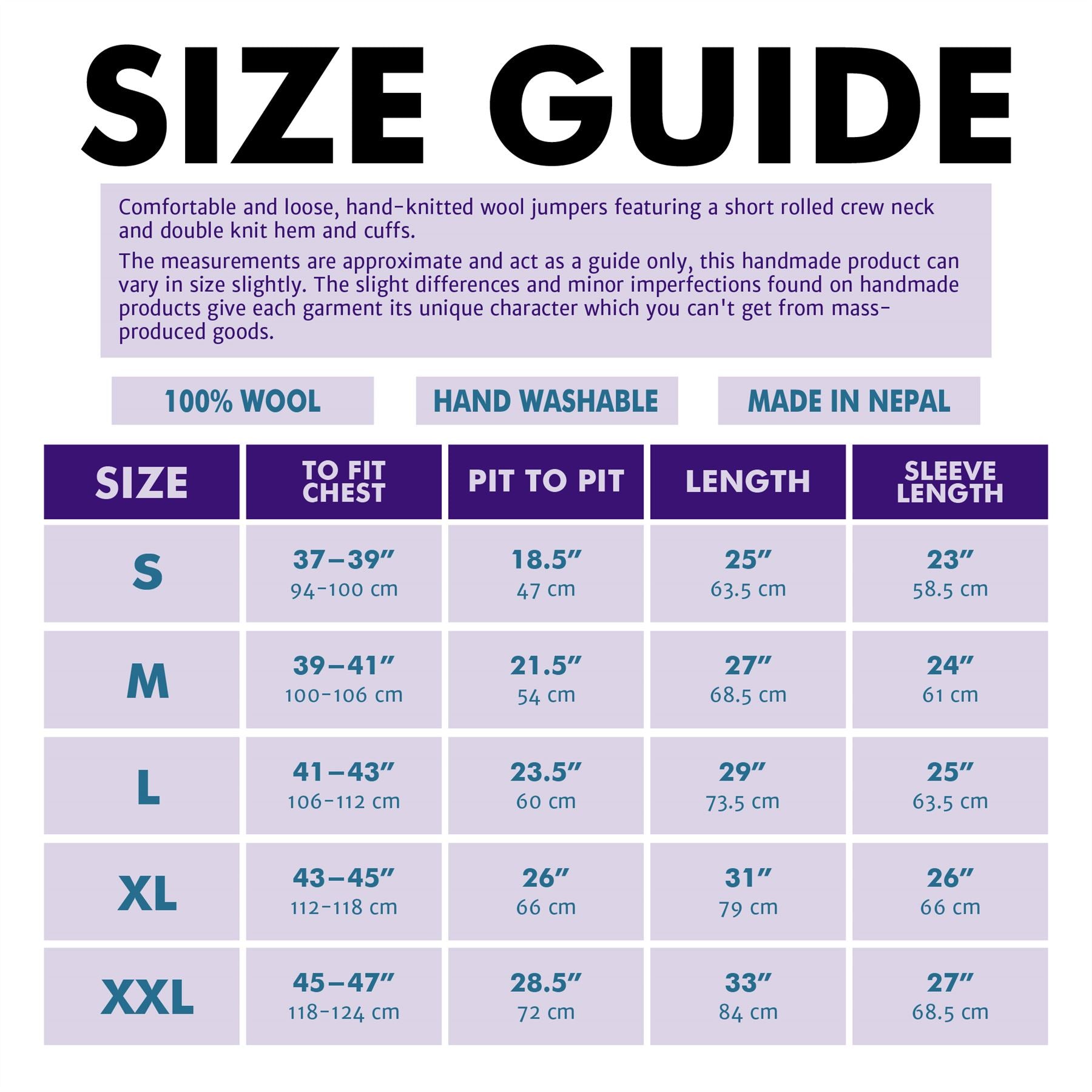 Made from 100% New Zealand sheep's wool and handcrafted in Nepal by artisans living and working in remote areas of the Kathmandu Valley, the wool is brought to the villages so that the knitters can maintain their close-knit families and communities rather than going away to work in Kathmandu for large portions of the year.