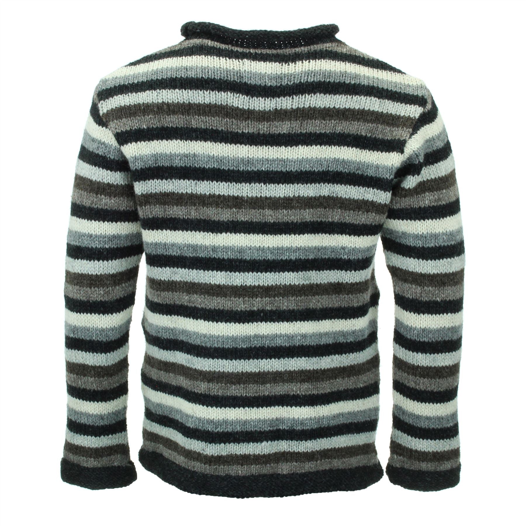 Comfortable and loose, hand-knitted wool jumpers featuring a crew neck, raglan sleeves, ribbed knit hem and cuffs. Available in various vibrant patterns. A lovely and cosy woollen pullover, perfect for layering up on cold days or just for lounging around the house.