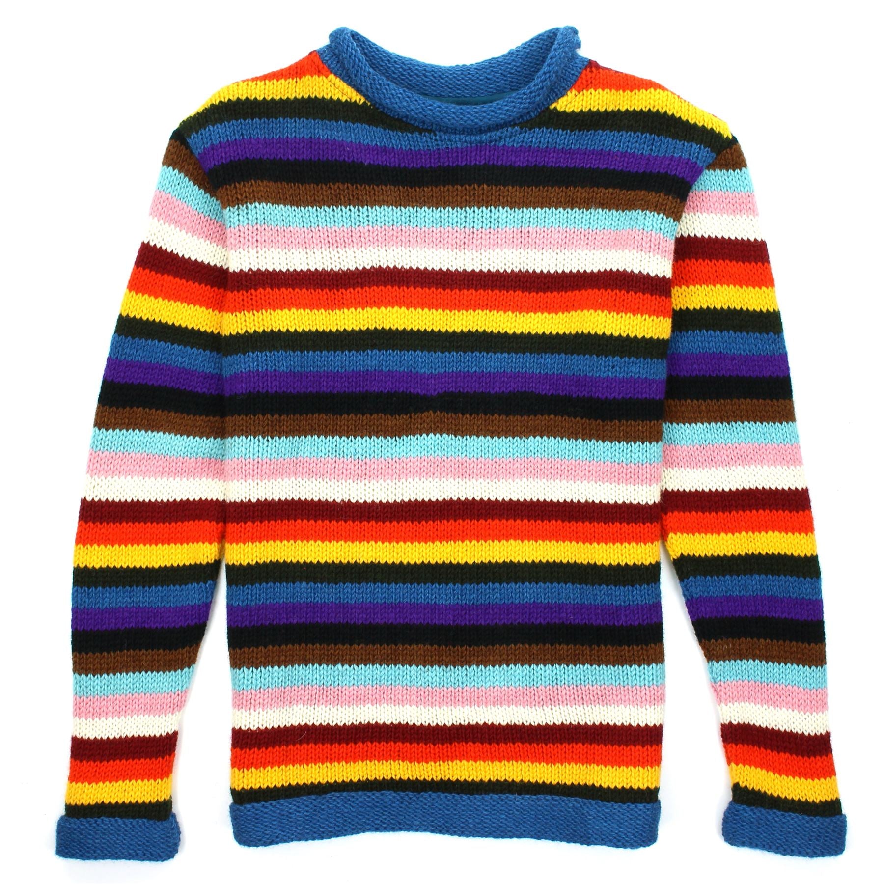 Comfortable and loose, hand-knitted wool jumpers featuring a crew neck, raglan sleeves, ribbed knit hem and cuffs. Available in various vibrant patterns. A lovely and cosy woollen pullover, perfect for layering up on cold days or just for lounging around the house.