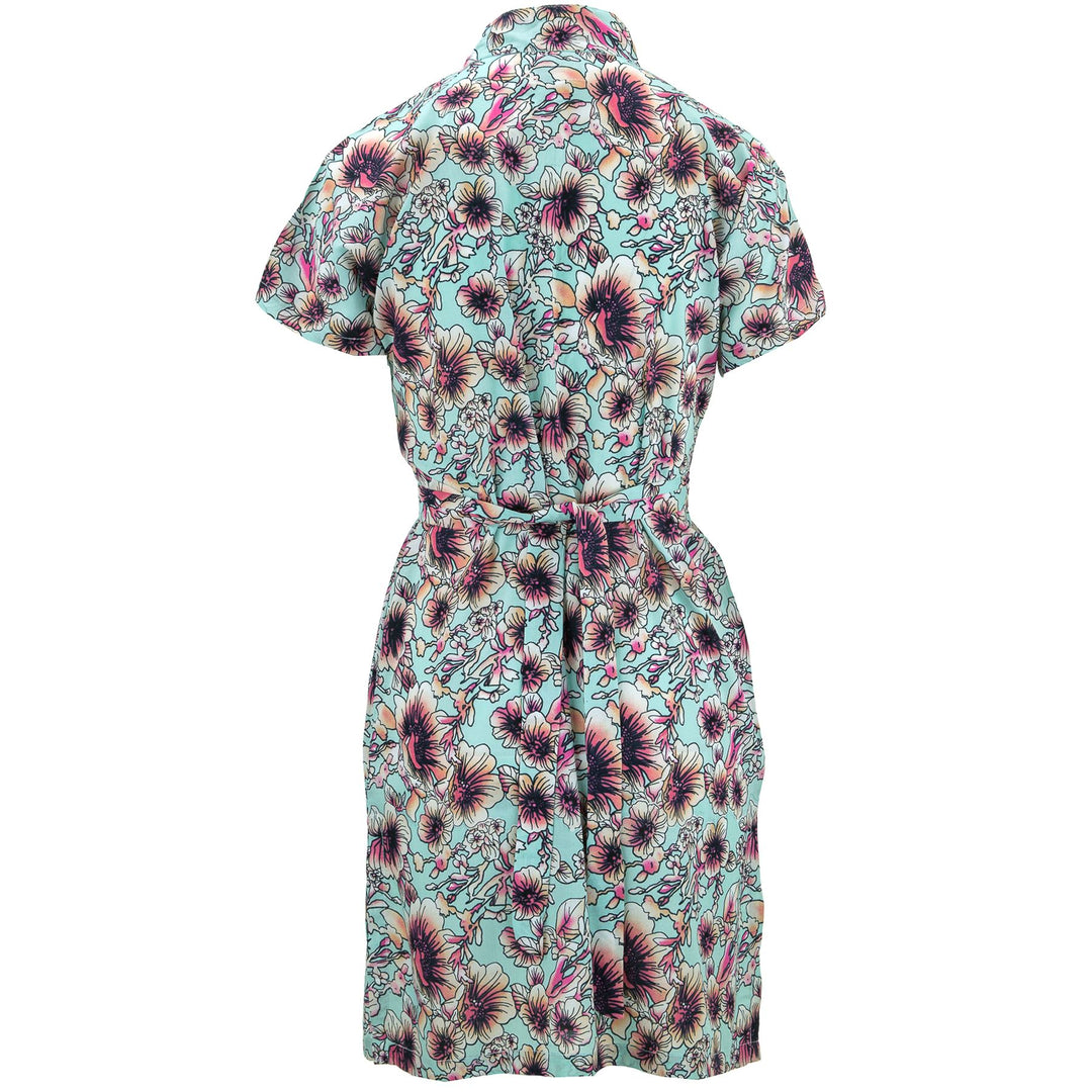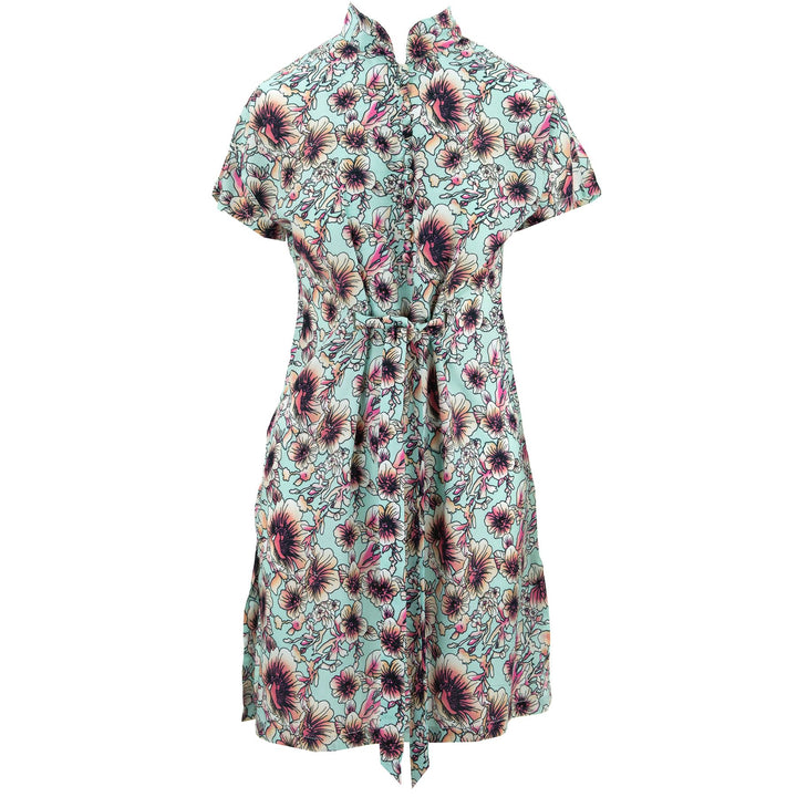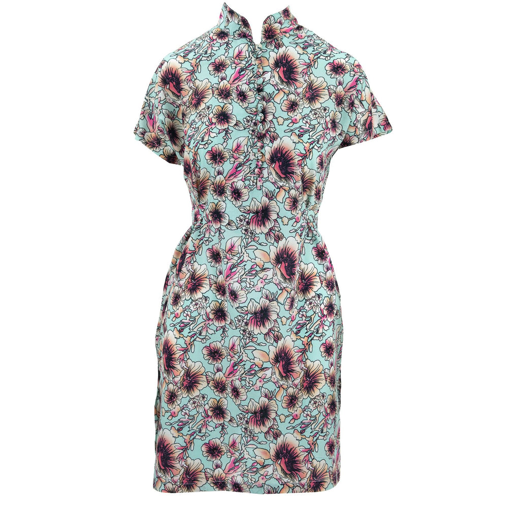 A softprint dress that can be worn to work or a special occasion. With a Mandarin collar and covered buttons with a belt that can be fastened front or back.
