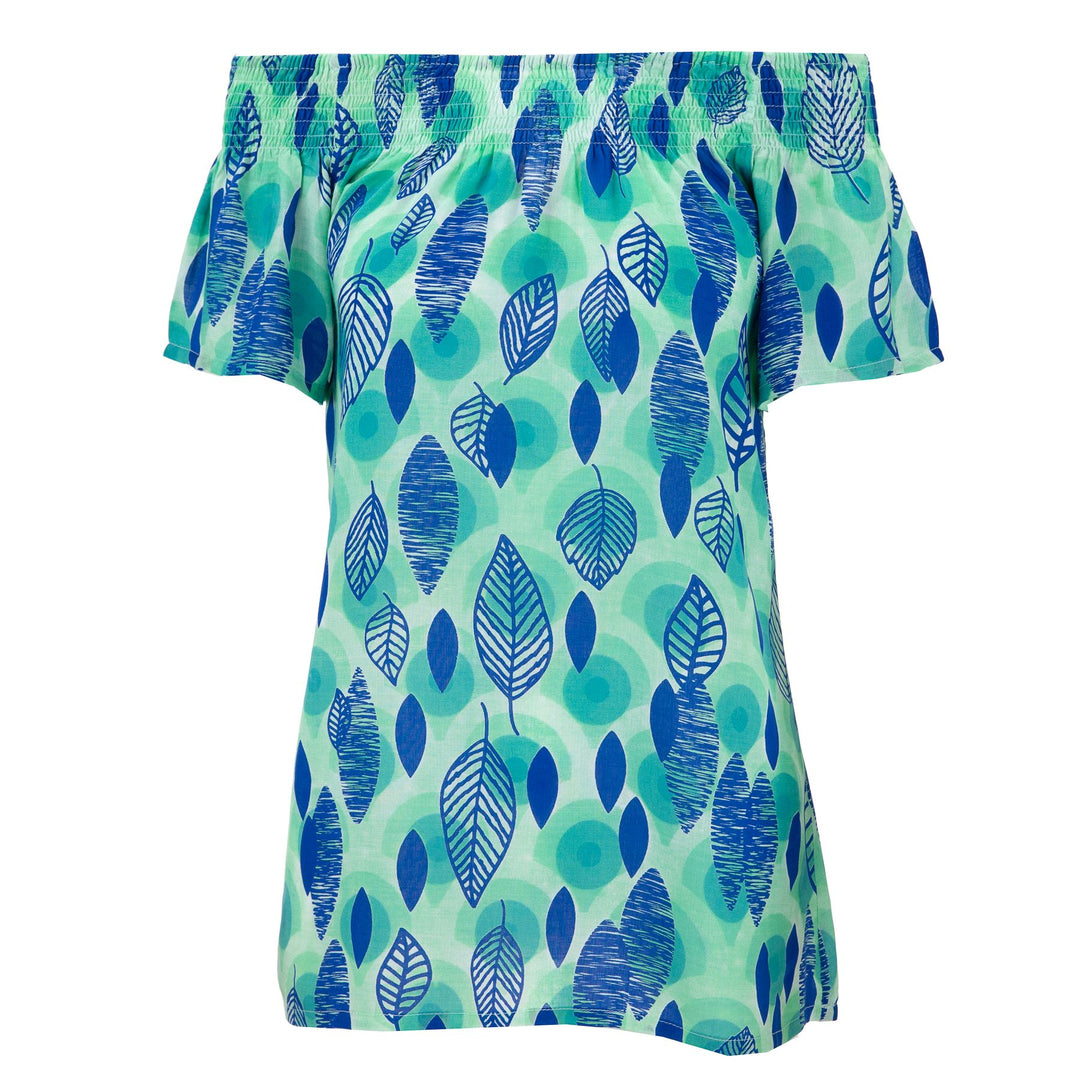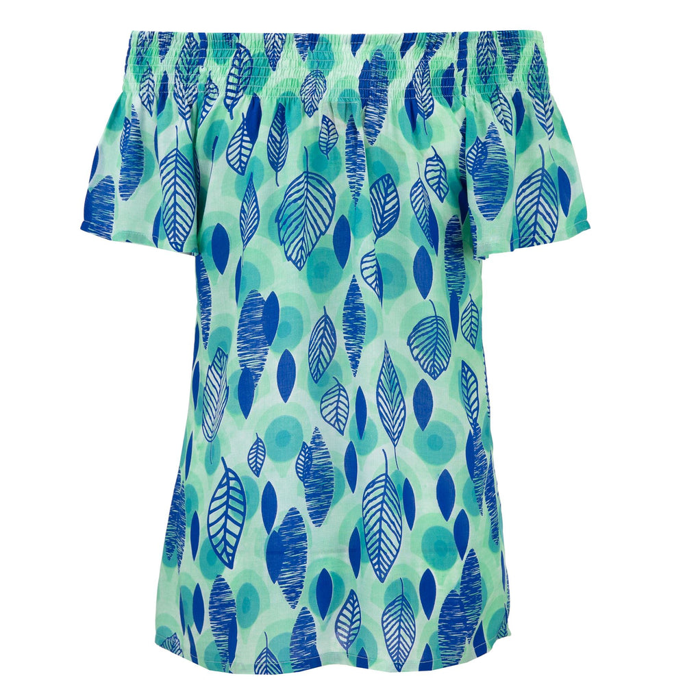 Our most versatile top has a shirred neckline and can be worn or off the shoulder. Looks great with shorts, a skirt or trousers.