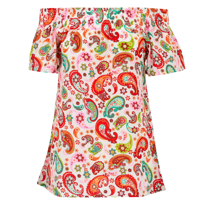 Our most versatile top has a shirred neckline and can be worn or off the shoulder. Looks great with shorts, a skirt or trousers.