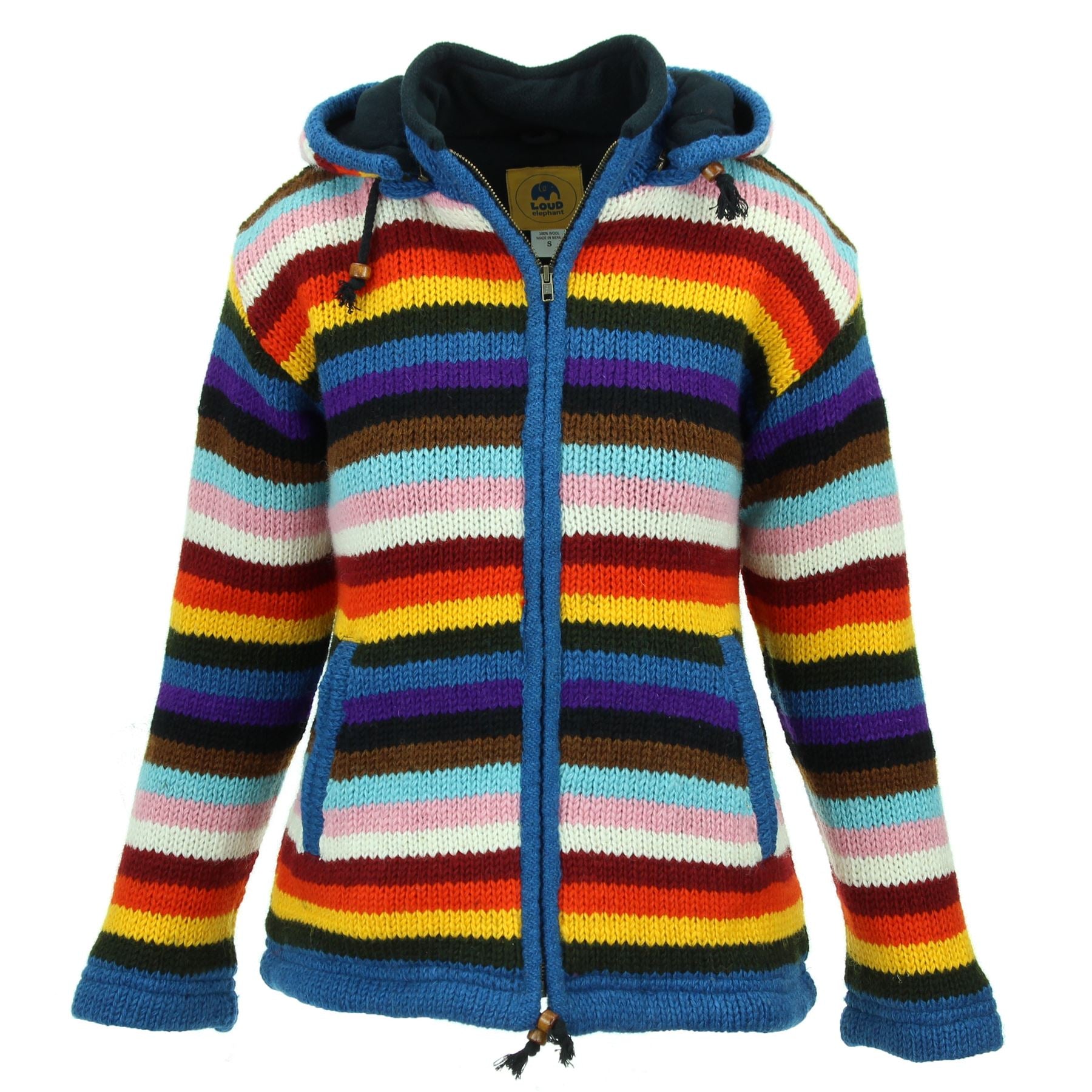 Handmade wool knit hooded zip jacket designed in a ladies fit with flared waist, a warm fleece lining, side pockets, inside pocket, and a removeable zipped hood for a flexible look. A practical hoodie cardigan, great for laying up throughout the colder months and keeping warm around the fire during cool summer evenings.