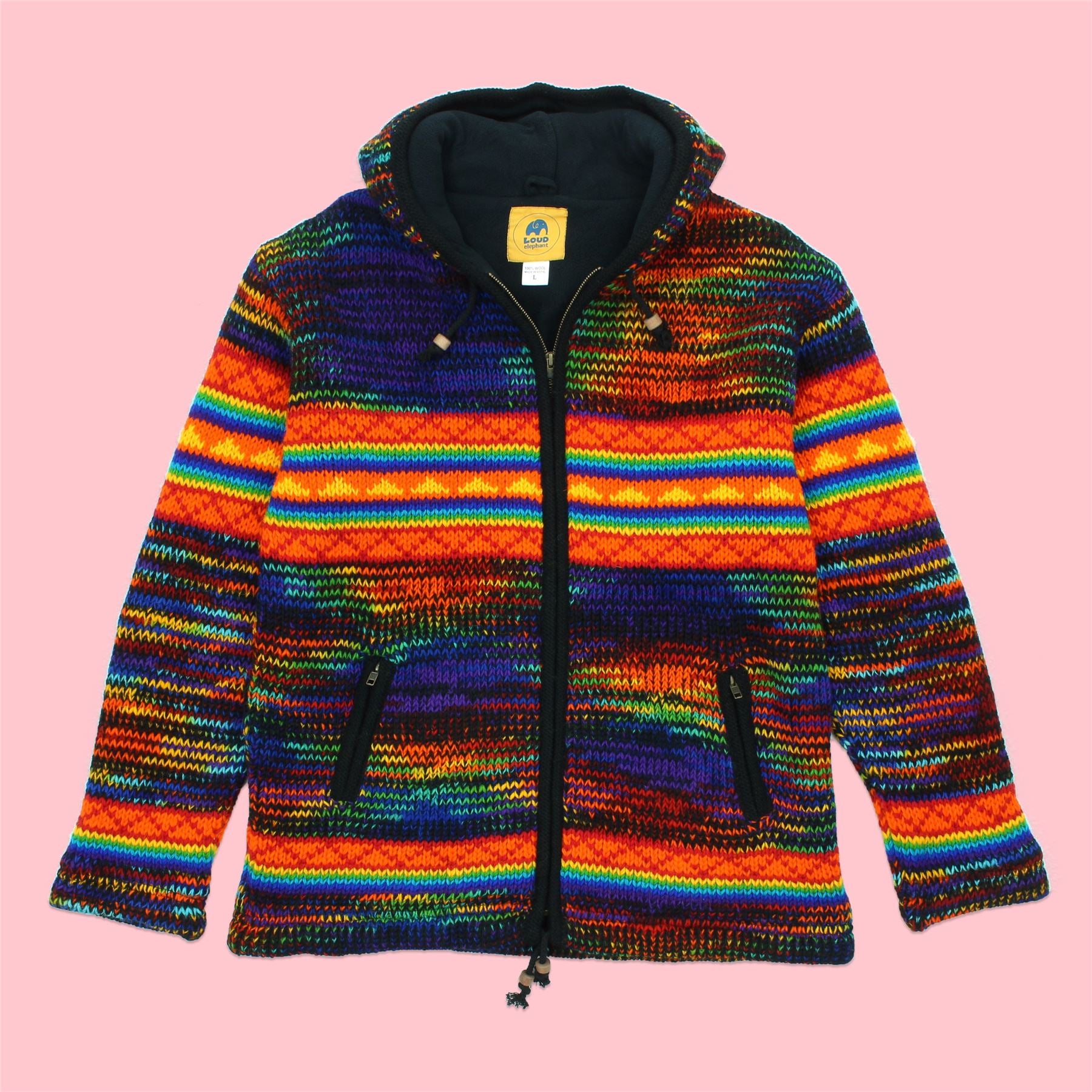 Handmade wool knit hooded zip jacket with a warm fleece lining, zip side pockets, and an inside pocket. A practical hoodie cardigan, great for laying up throughout the colder months and keeping warm around the fire during cool summer evenings.