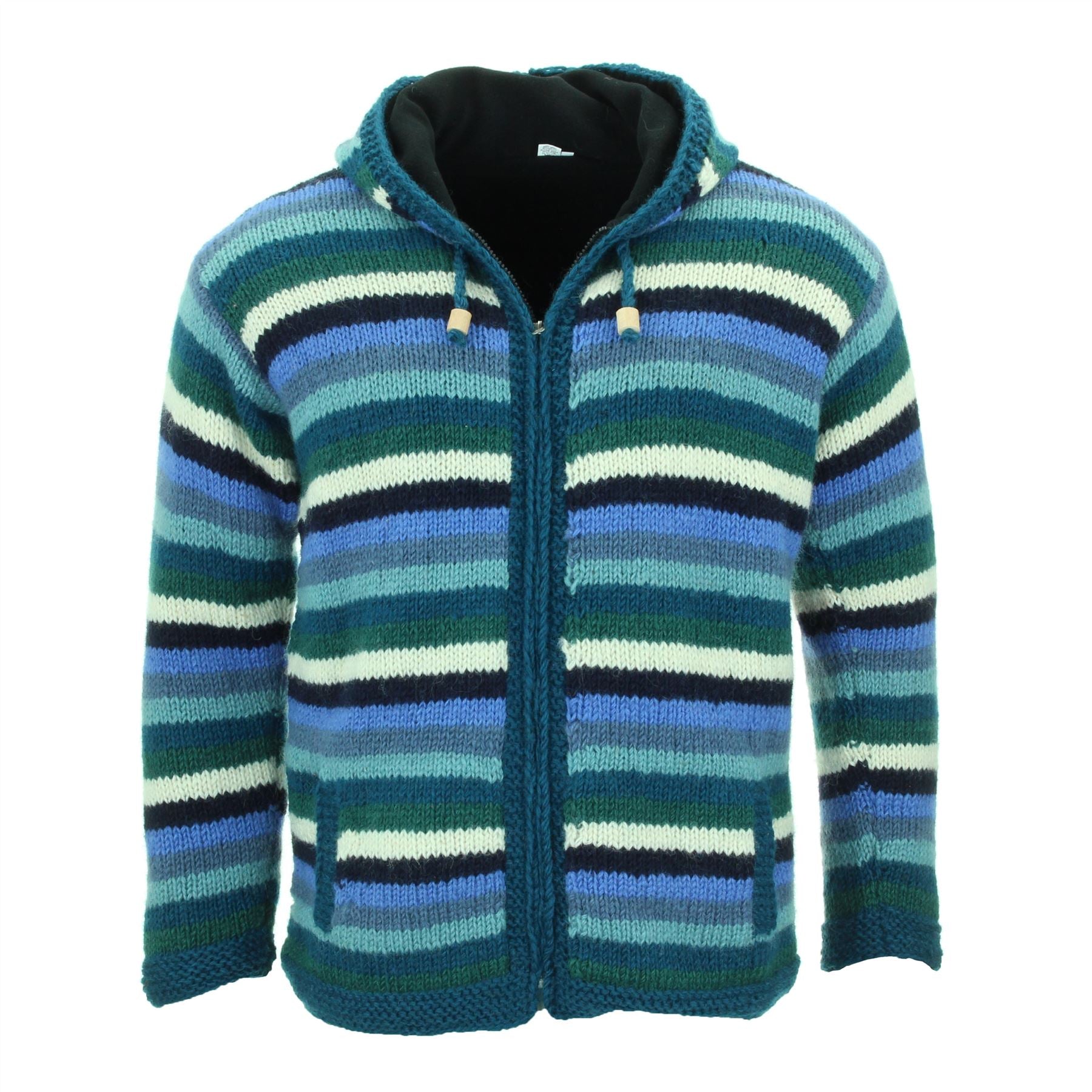 Hand Knitted Wool Hooded Jacket Cardigan - Stripe Blue
