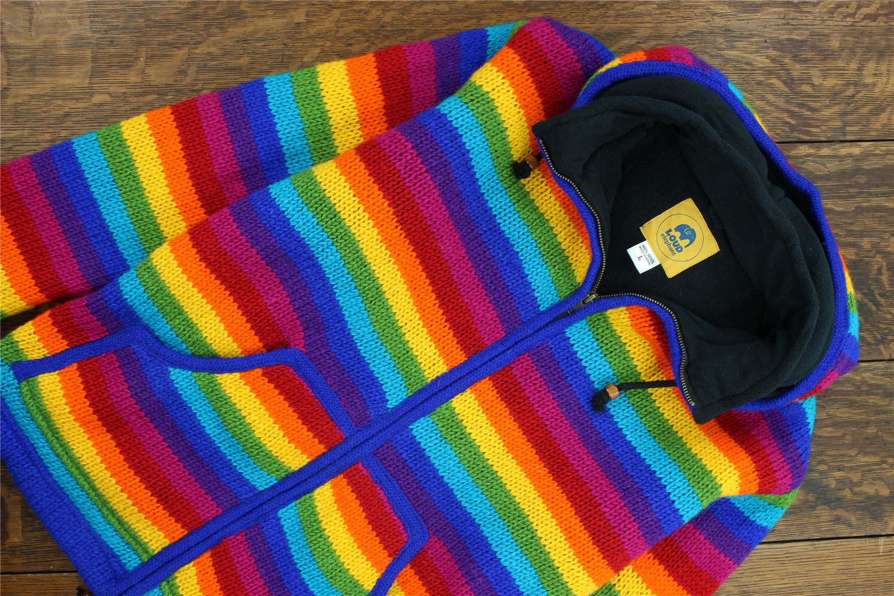 Handmade wool knit hooded zip jacket with a warm fleece lining, front pouch pocket, inside pocket, and a removeable zipped hood for a flexible look. A practical hoodie cardigan, great for laying up throughout the colder months and keeping warm around the fire during cool summer evenings.