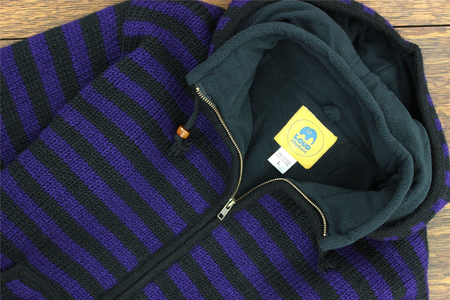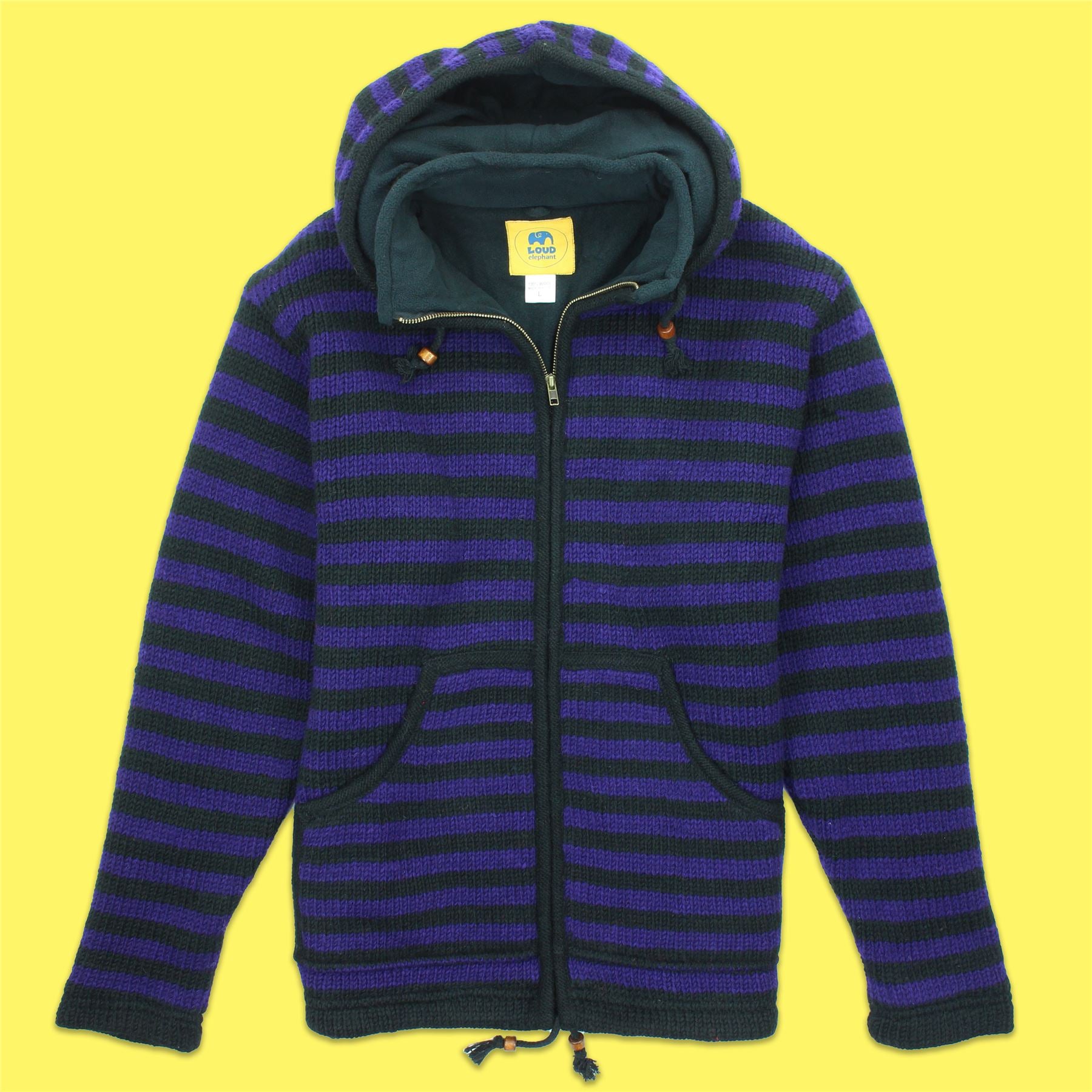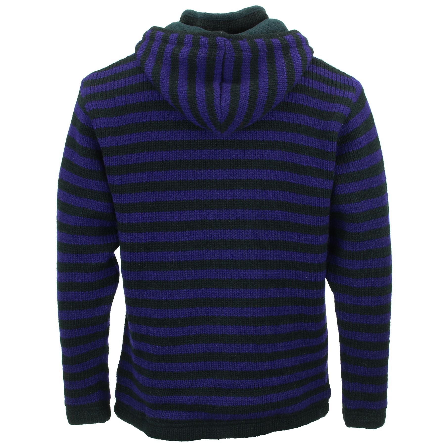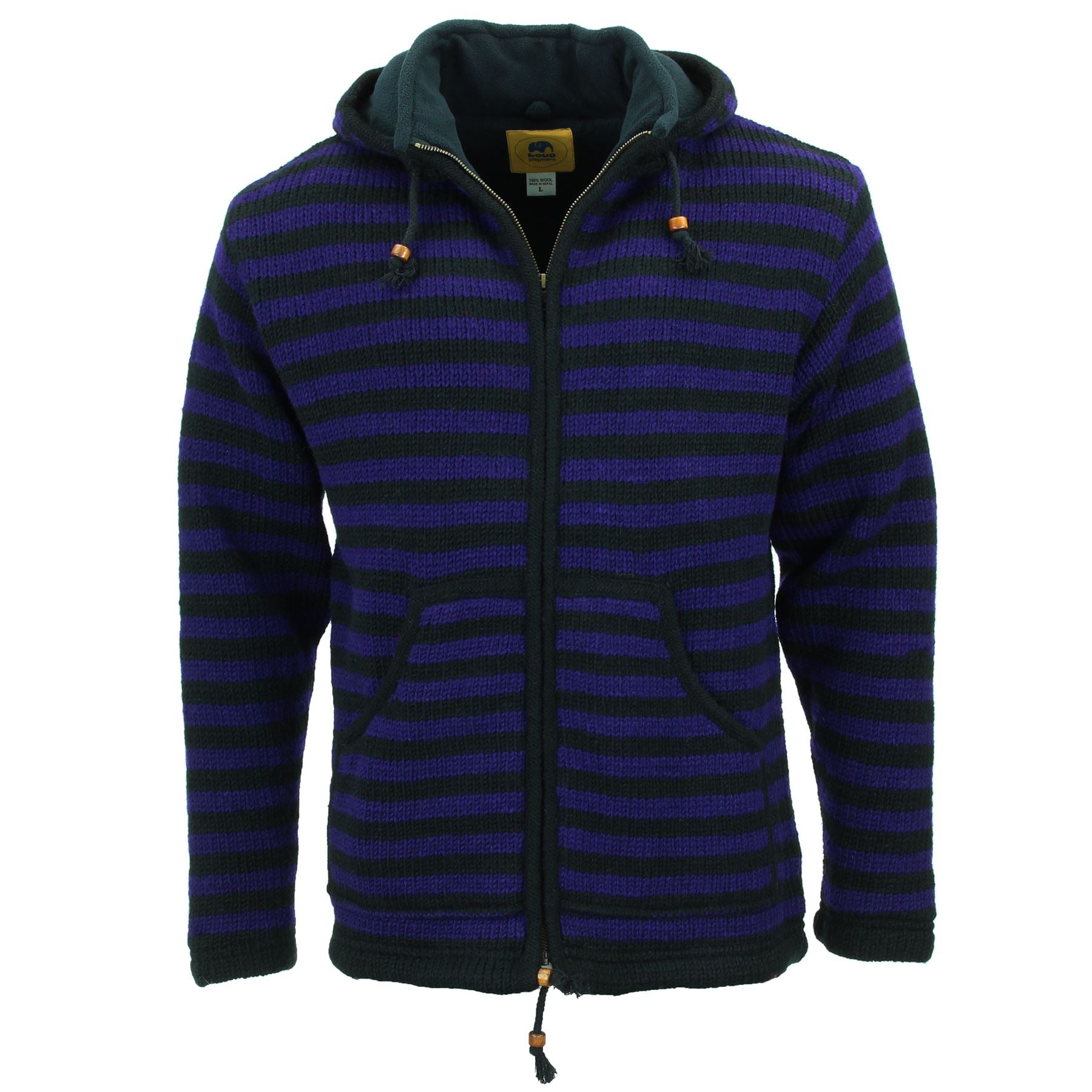 Handmade wool knit hooded zip jacket with a warm fleece lining, front pouch pocket, inside pocket, and a removeable zipped hood for a flexible look. A practical hoodie cardigan, great for laying up throughout the colder months and keeping warm around the fire during cool summer evenings.