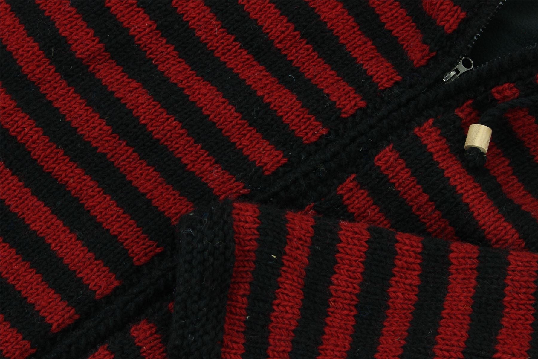 Hand Knitted Wool Hooded Jacket Cardigan - Stripe Red Black