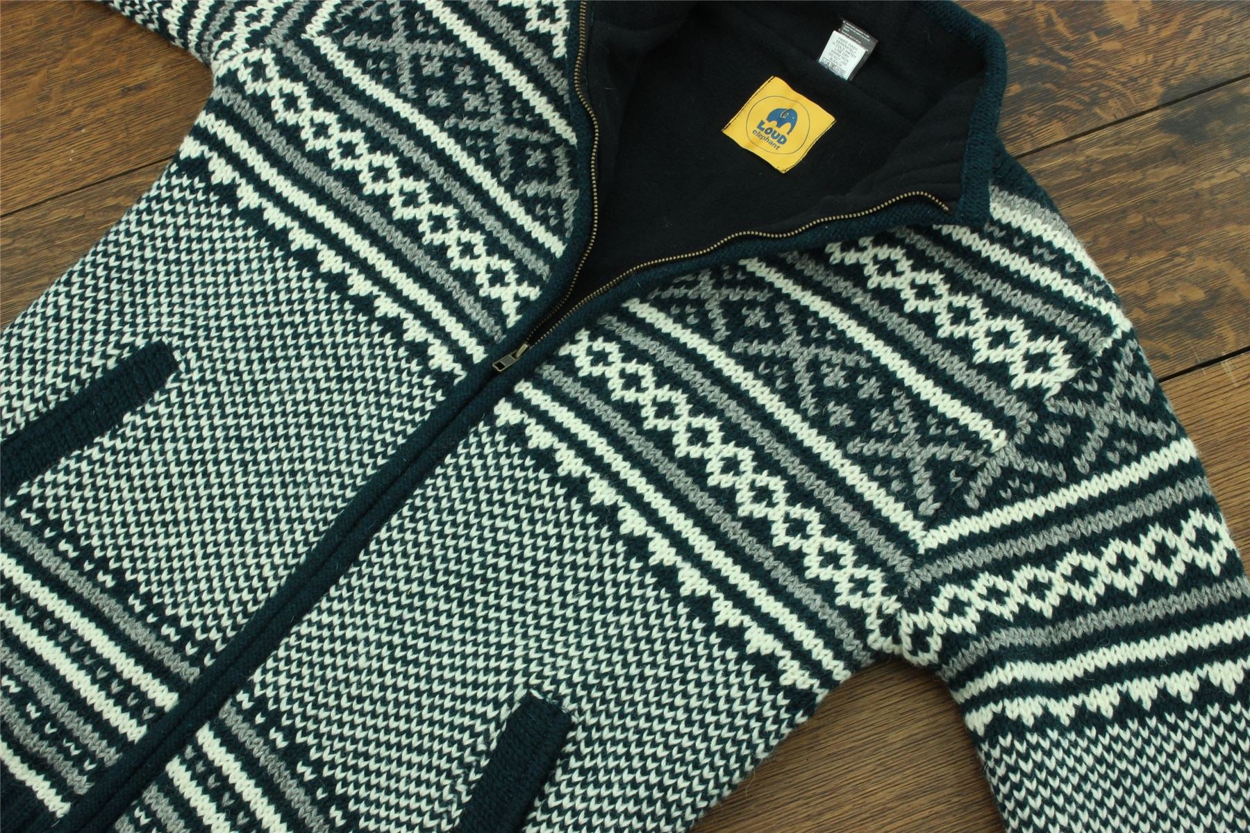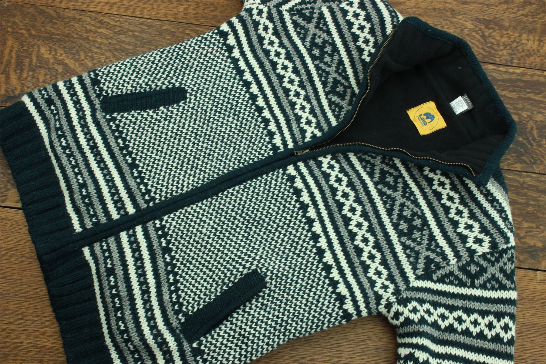Handmade wool knit zipped jacket with a warm fleece lining, side pockets, and an inside pocket. A practical cardigan, great for laying up throughout the colder months and keeping warm around the fire during cool summer evenings.