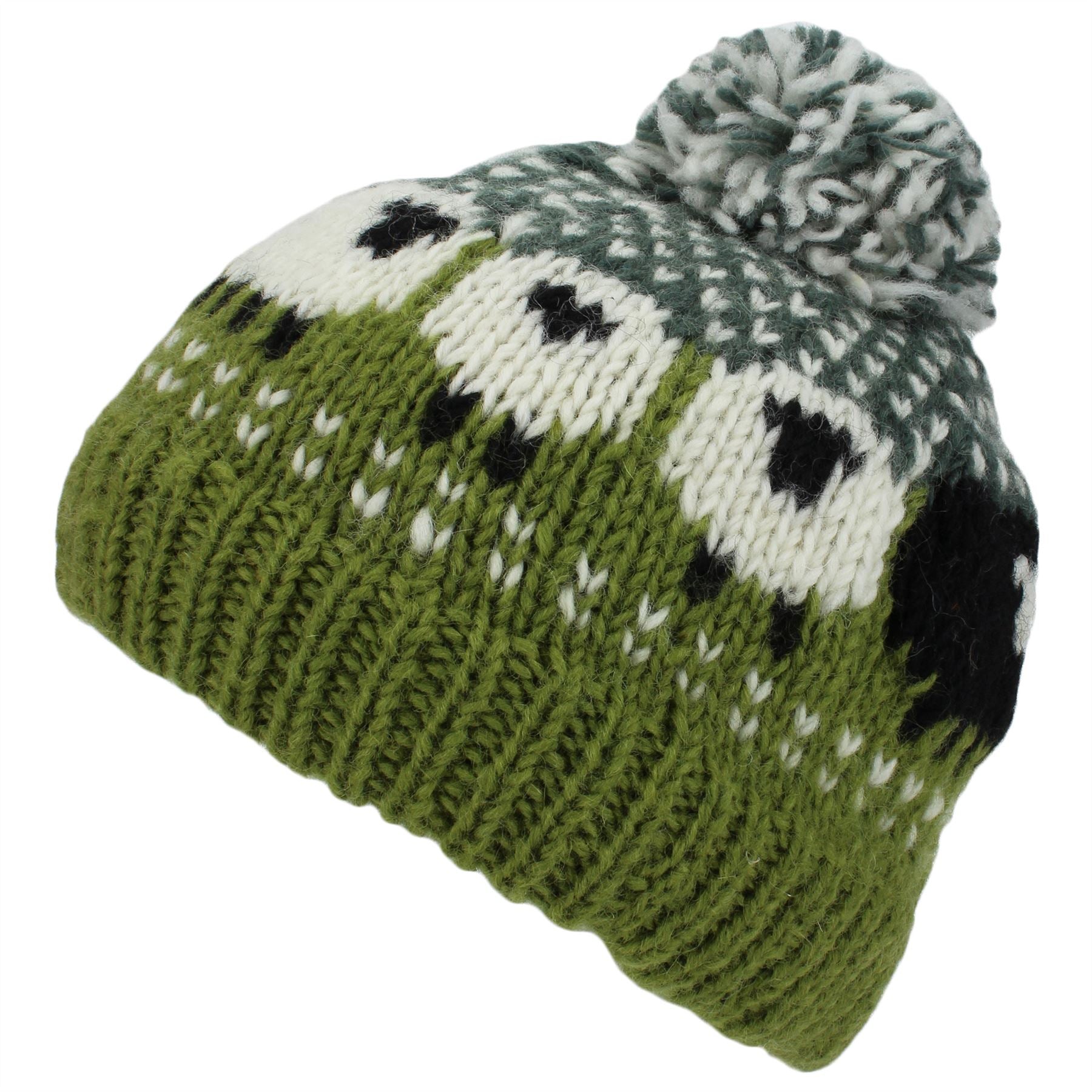 Chunky wool knit beanie hat with a bobble, a turn up and knitted sheep surrounding the crown. The warm fleece band lining makes this a great winter hat suitable for most head sizes.