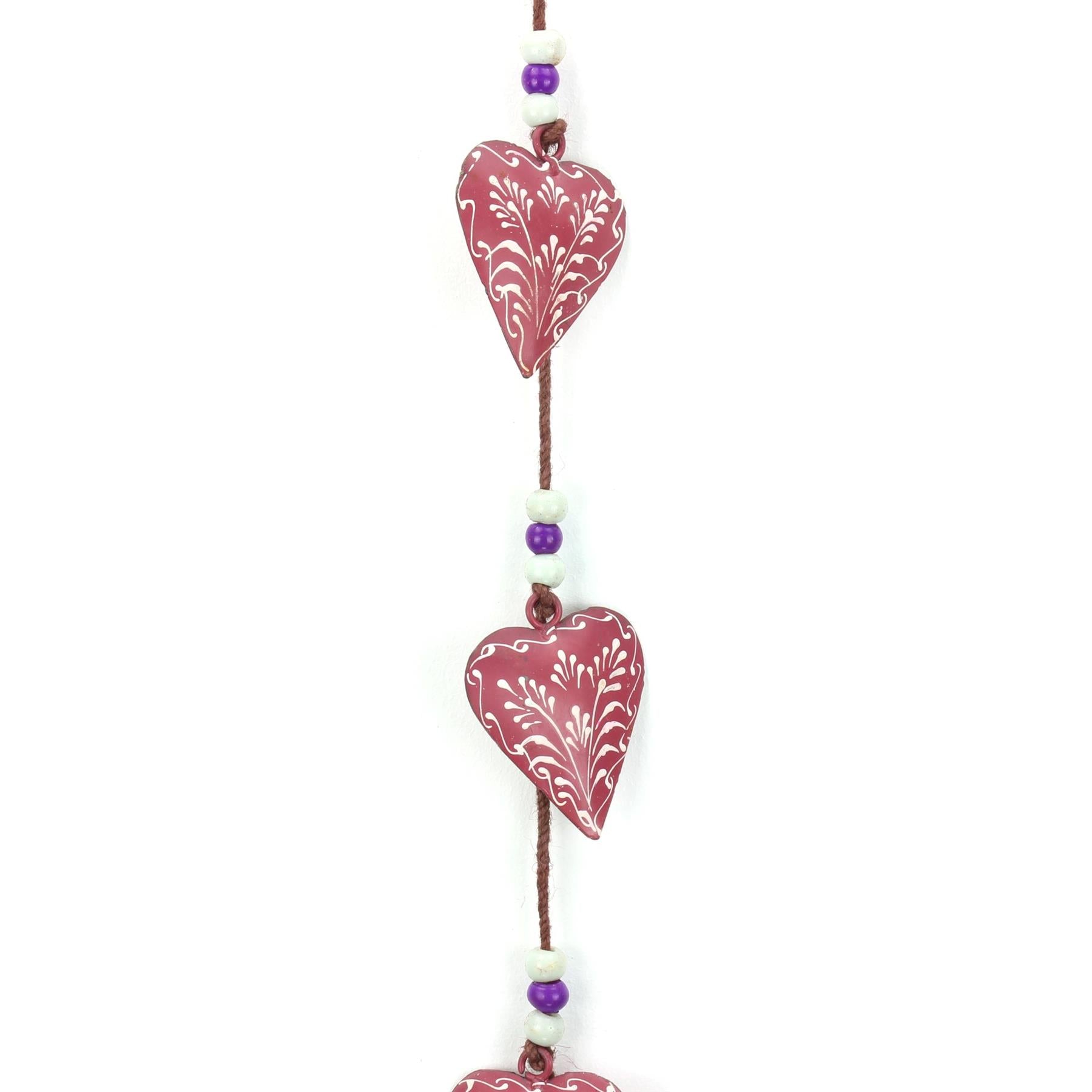 A lovely string of hand-painted metal hearts, featuring five hearts and multi-coloured beads on a chunky rustic string.