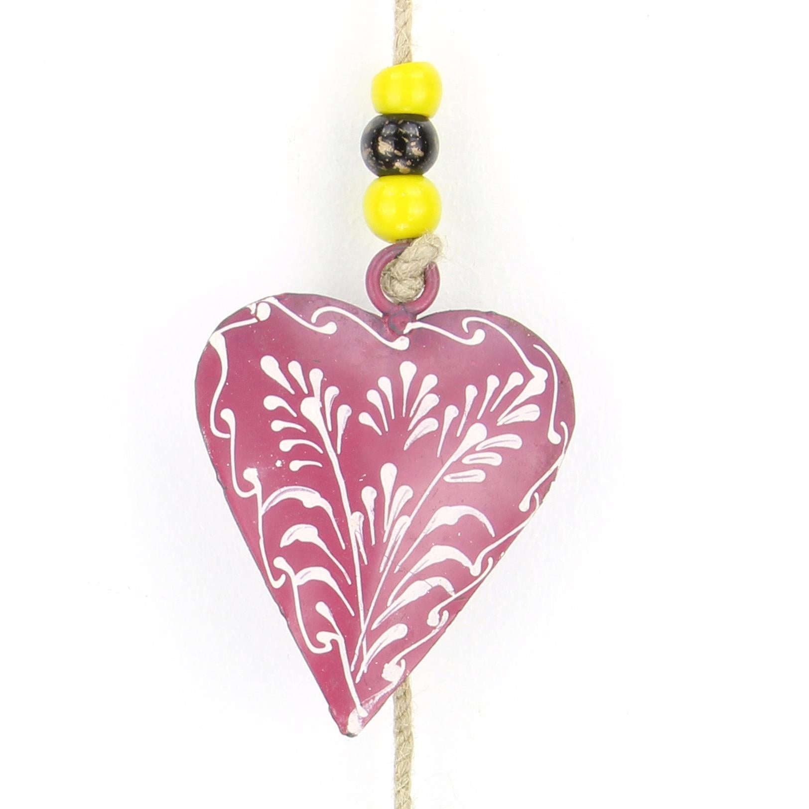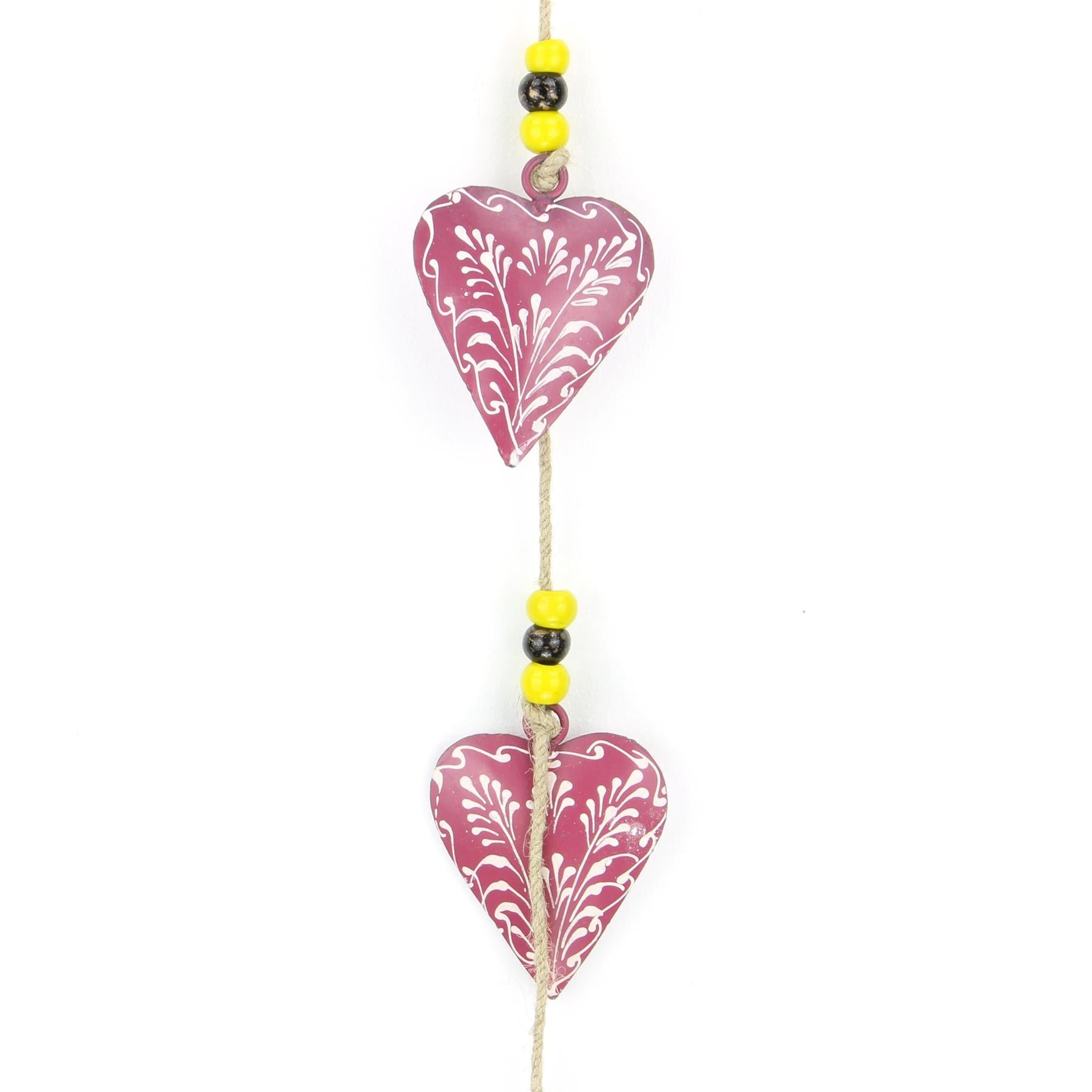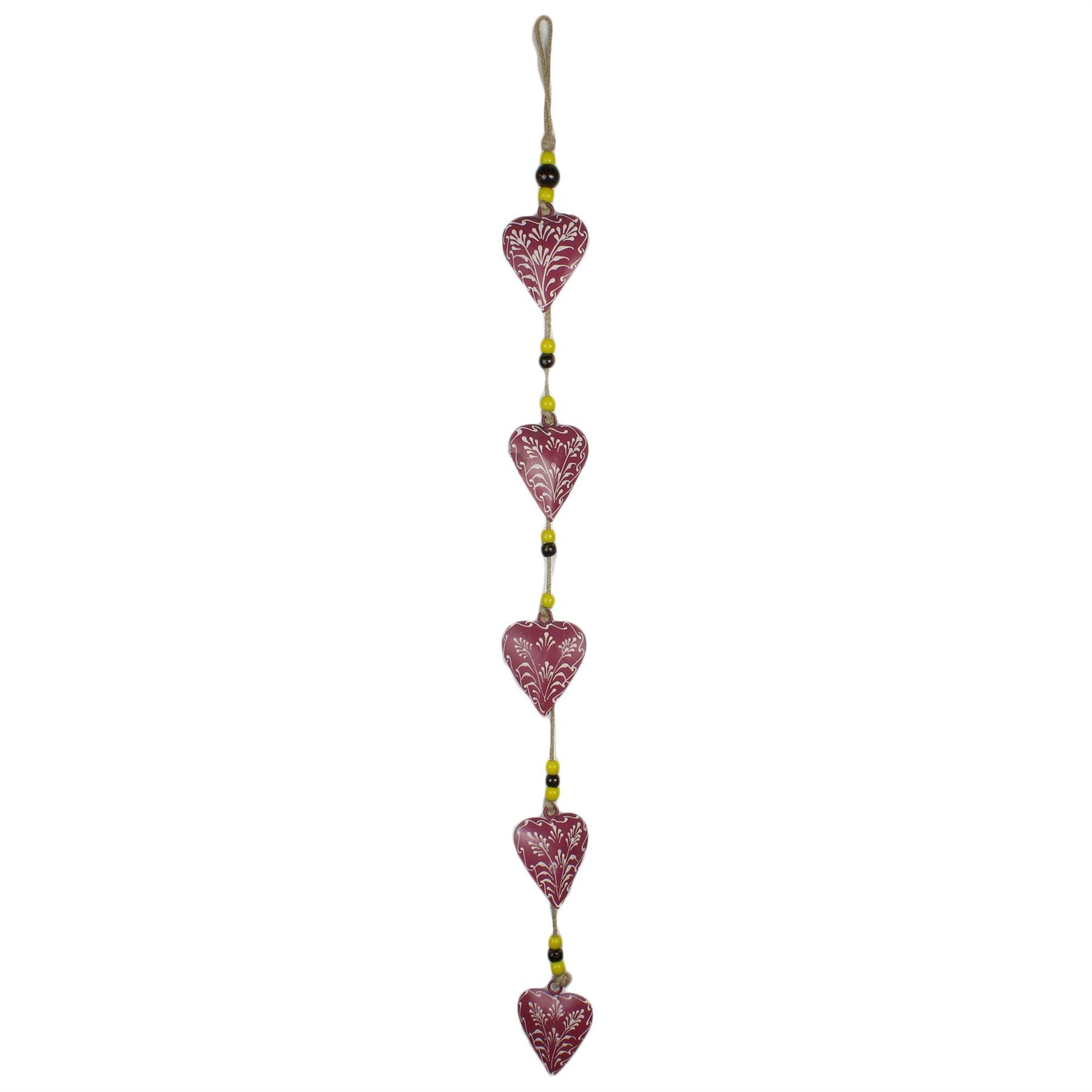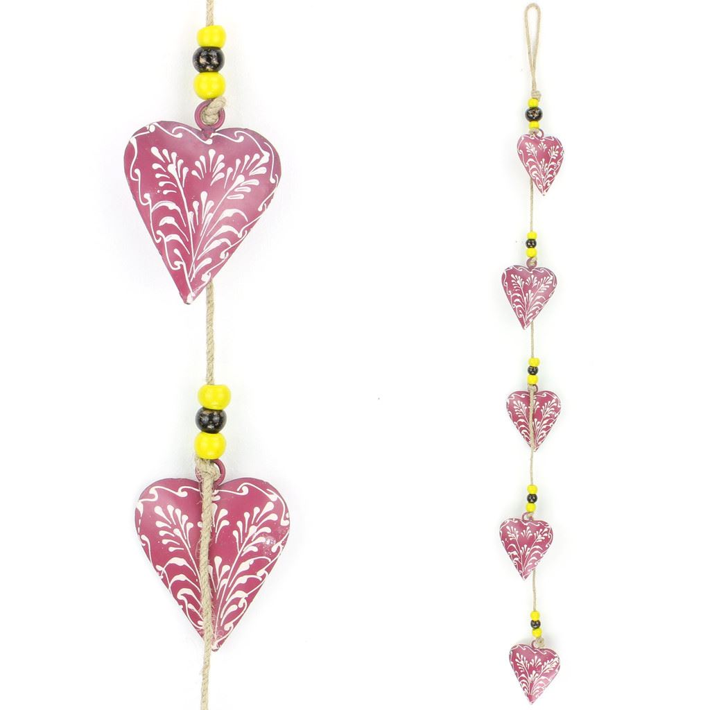 A lovely string of hand-painted metal hearts, featuring five hearts and multi-coloured beads on a chunky rustic string.