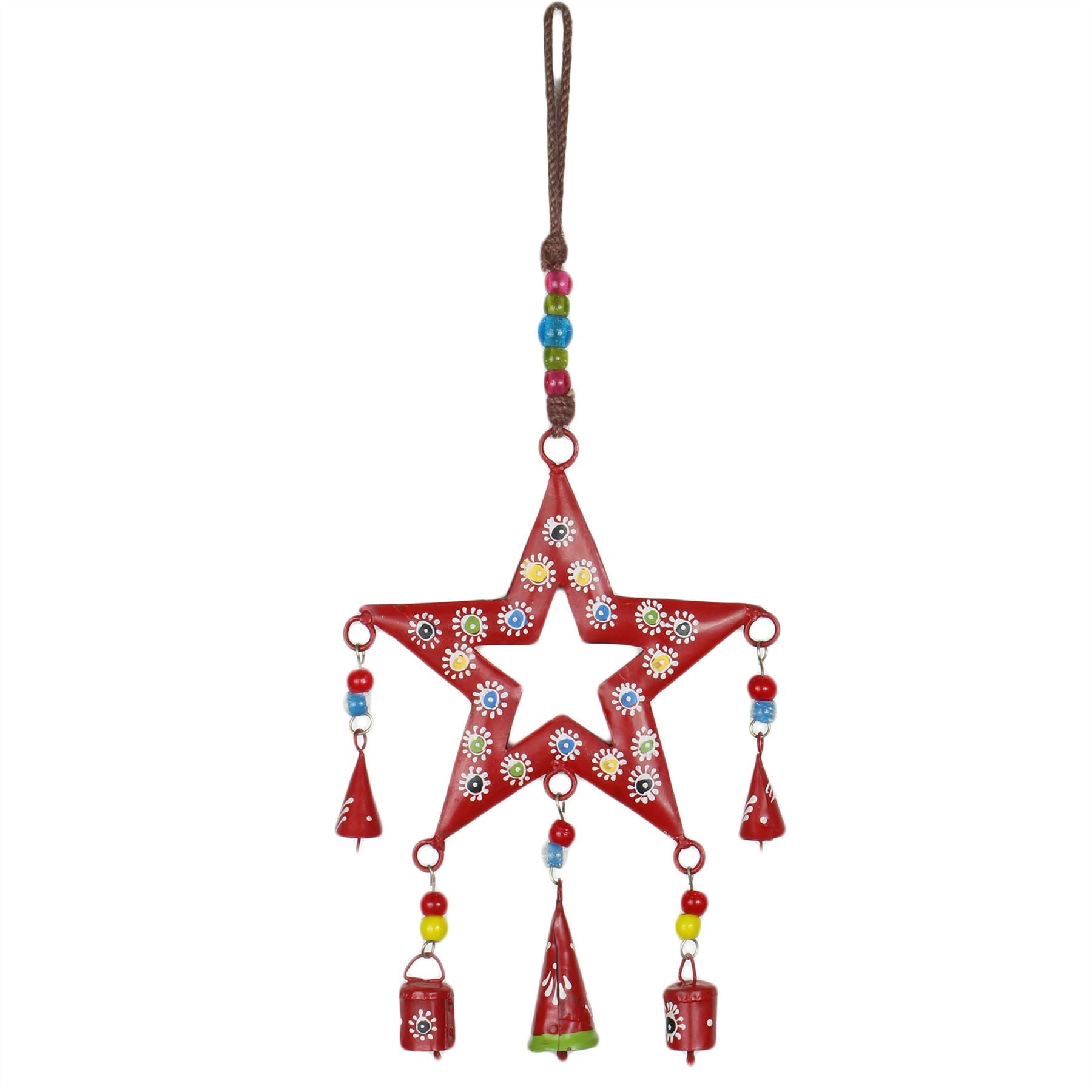 A beautiful hand-painted metal star, featuring 5 dangling bells and multi-coloured beads tied to a chunky rustic string.