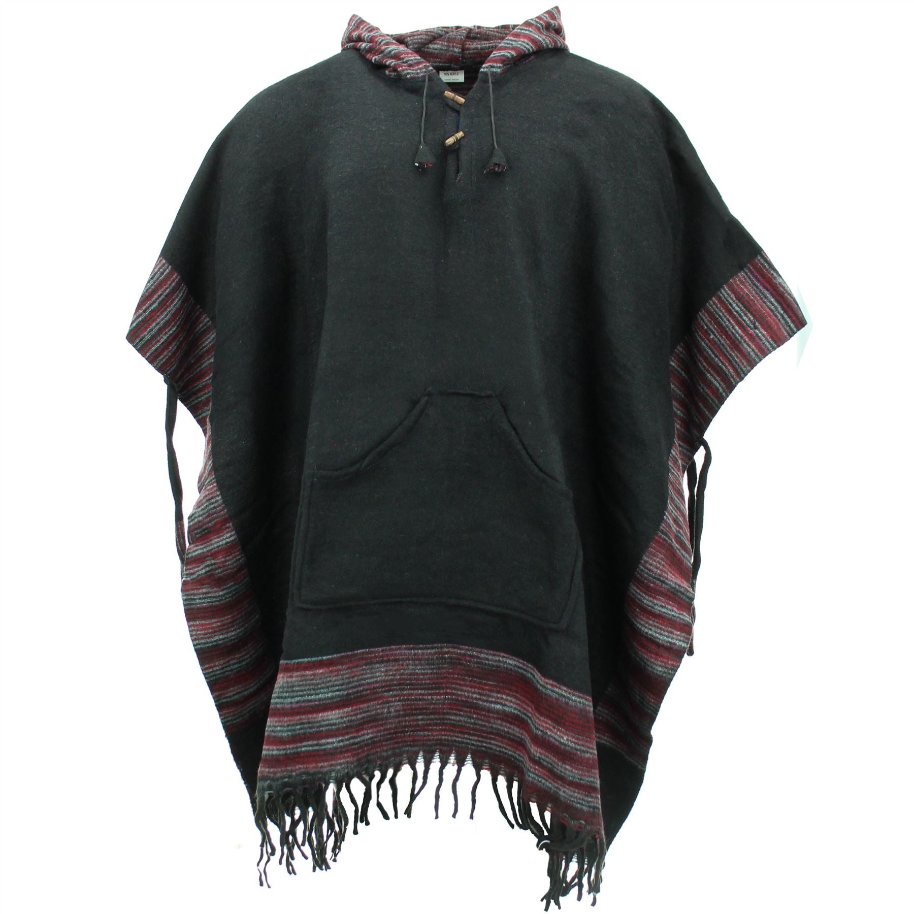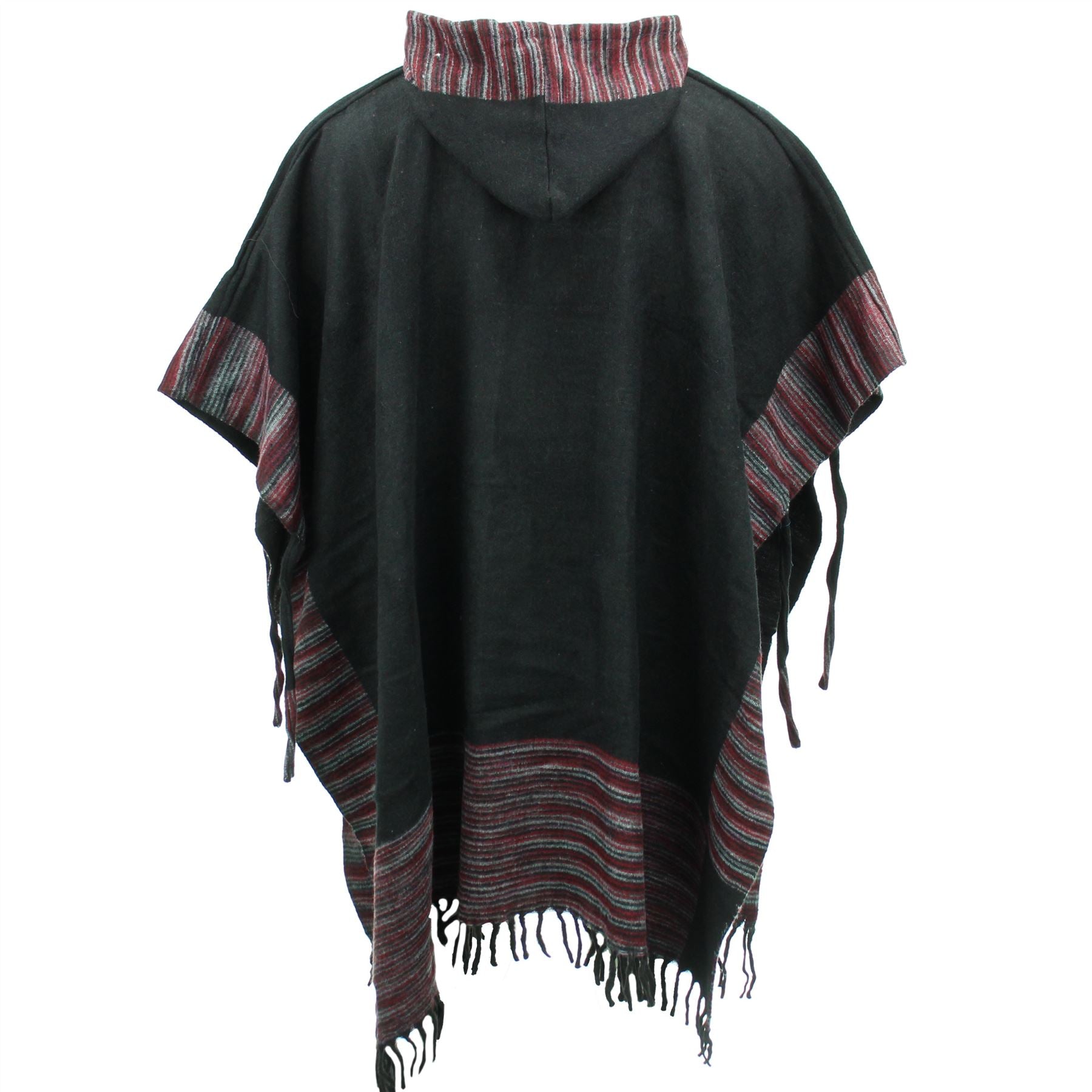 Soft Vegan Wool Hooded Tibet Poncho - Black & Red Grey