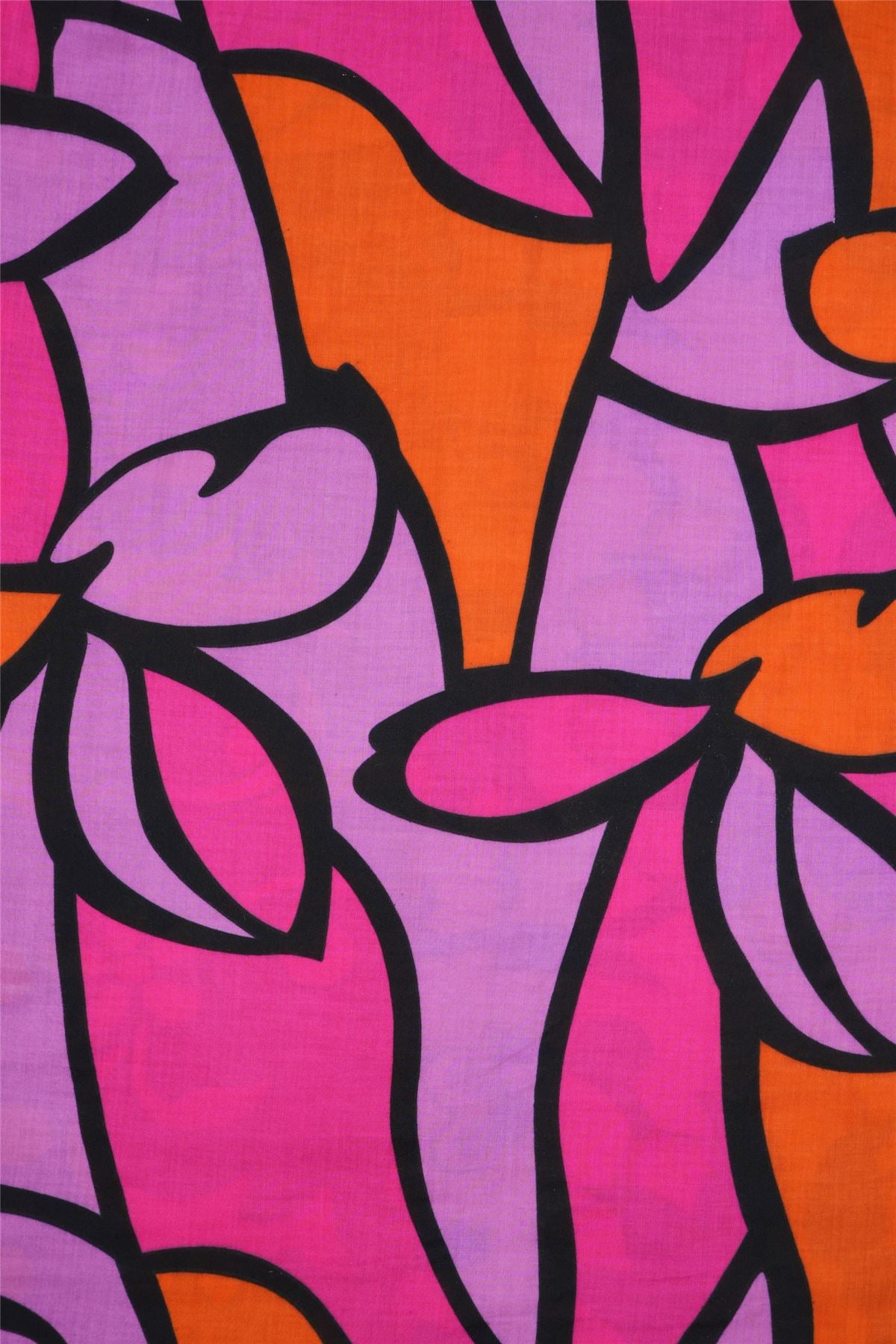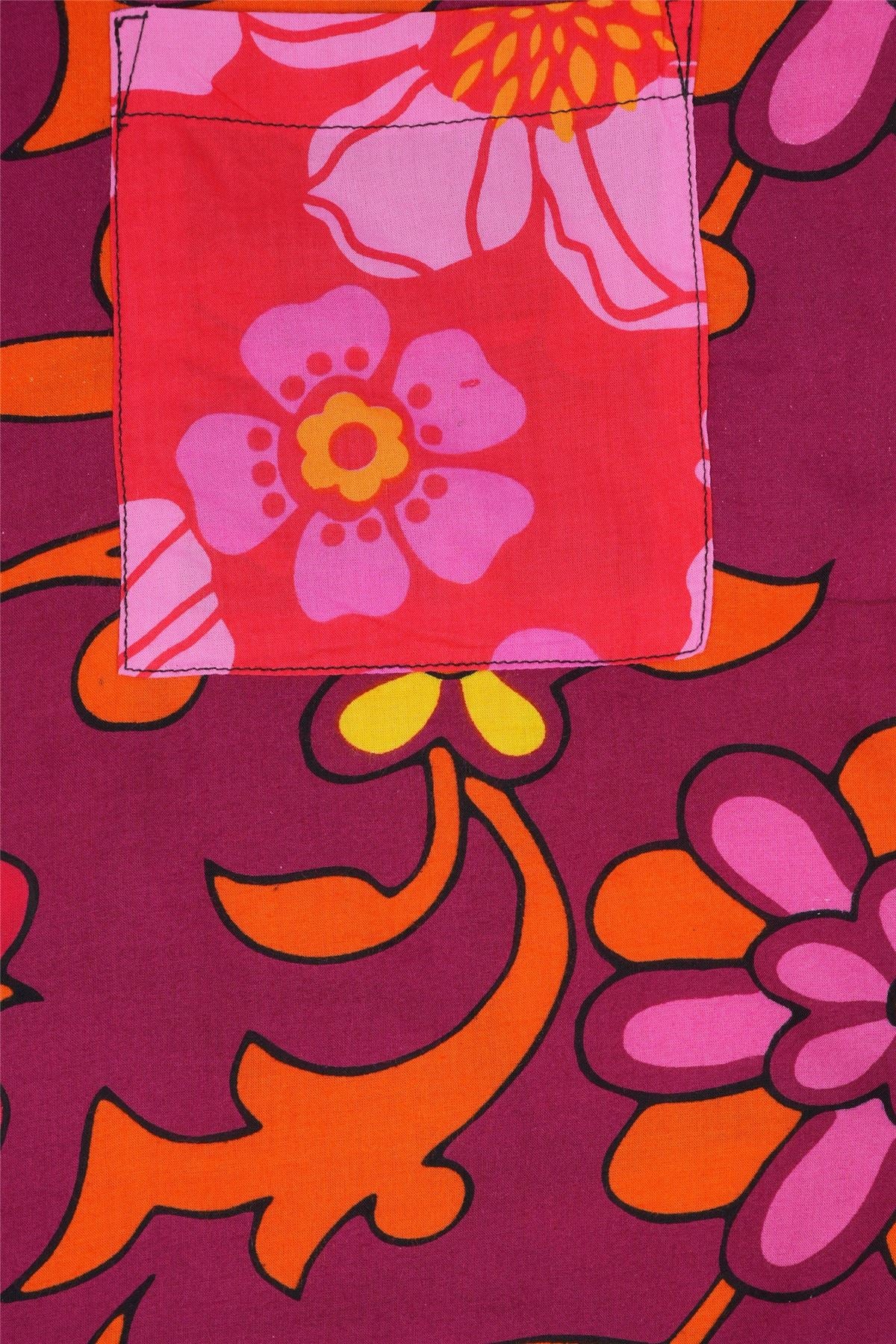A bold retro floral shirt bursting with vivid pinks, oranges, blues and purples arranged in an eye catching split panel design.