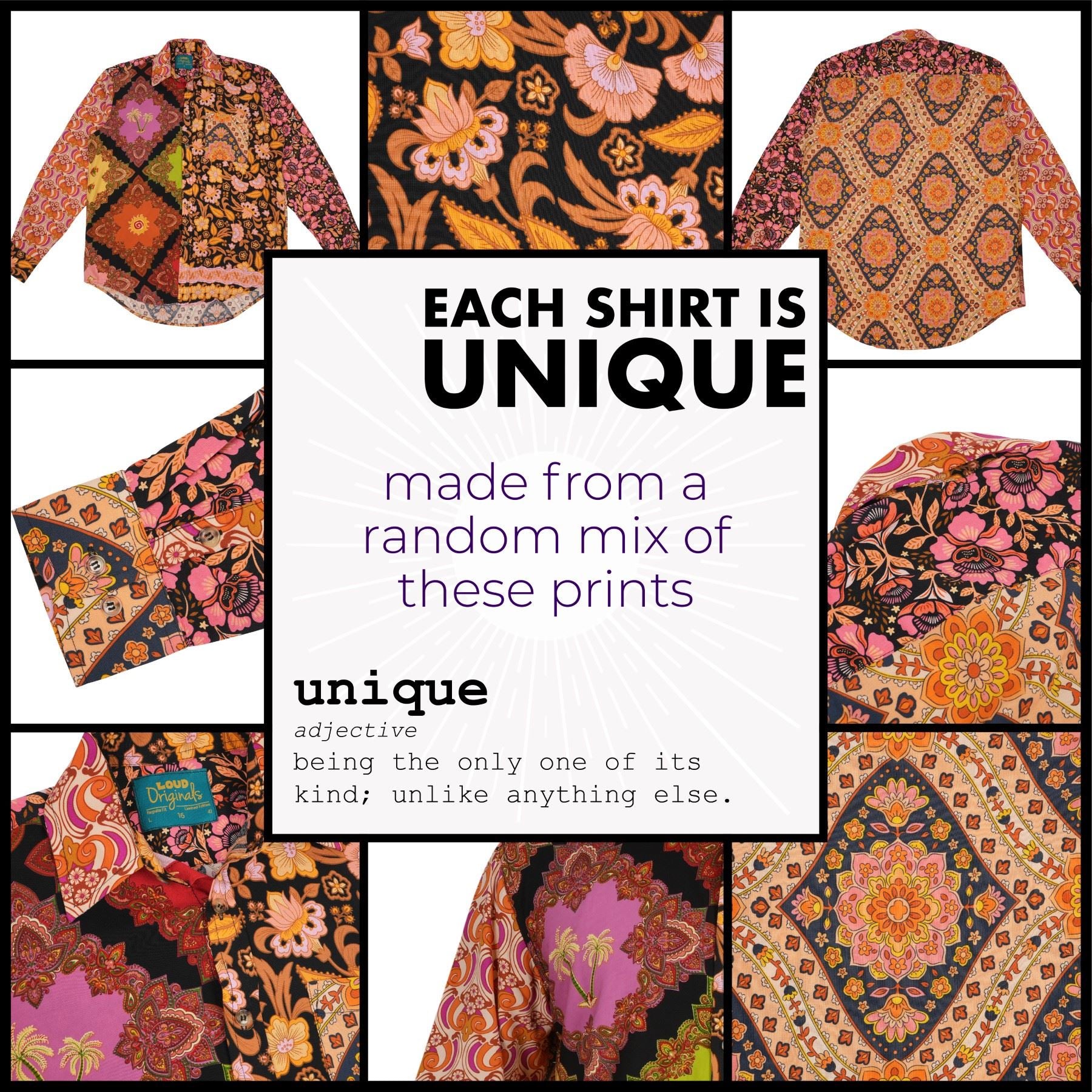 EACH SHIRT IS DIFFERENT! Our Random Mixed Panel shirts are all made from a specific mix of the fabrics shown in the image swatches, but it is pure luck where they will feature on each shirt, a specific fabric could be used for the arm on one shirt or the pocket of another, they have been randomly mixed up.