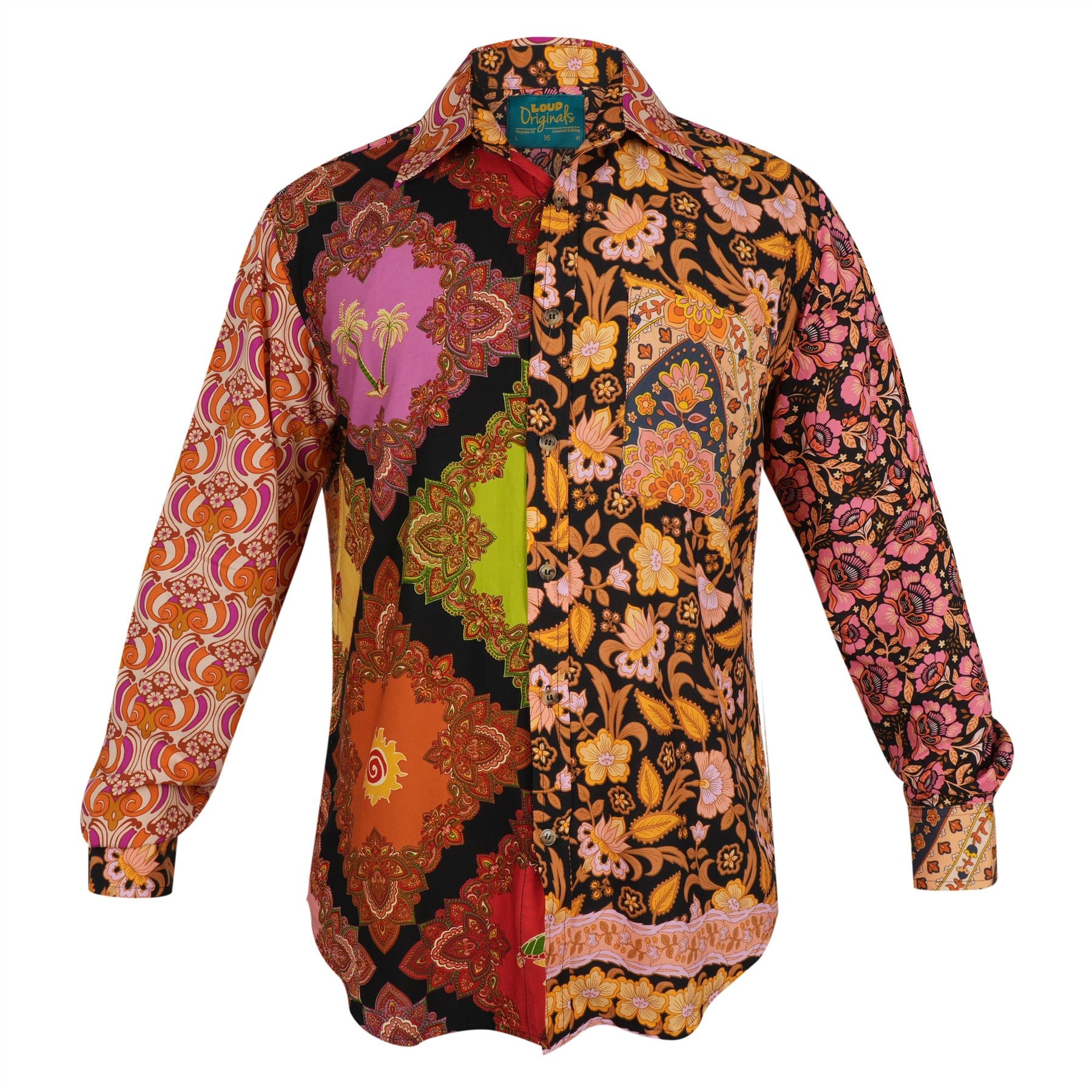 A bold patchwork shirt combining vibrant paisley, florals, and geometric motifs for a striking, statement making look.
