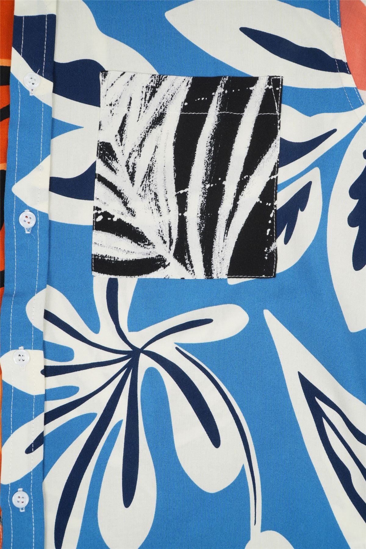 A bold long sleeve shirt combining contrasting tropical leaf prints in vibrant orange, blue and coral for a standout summer statement.