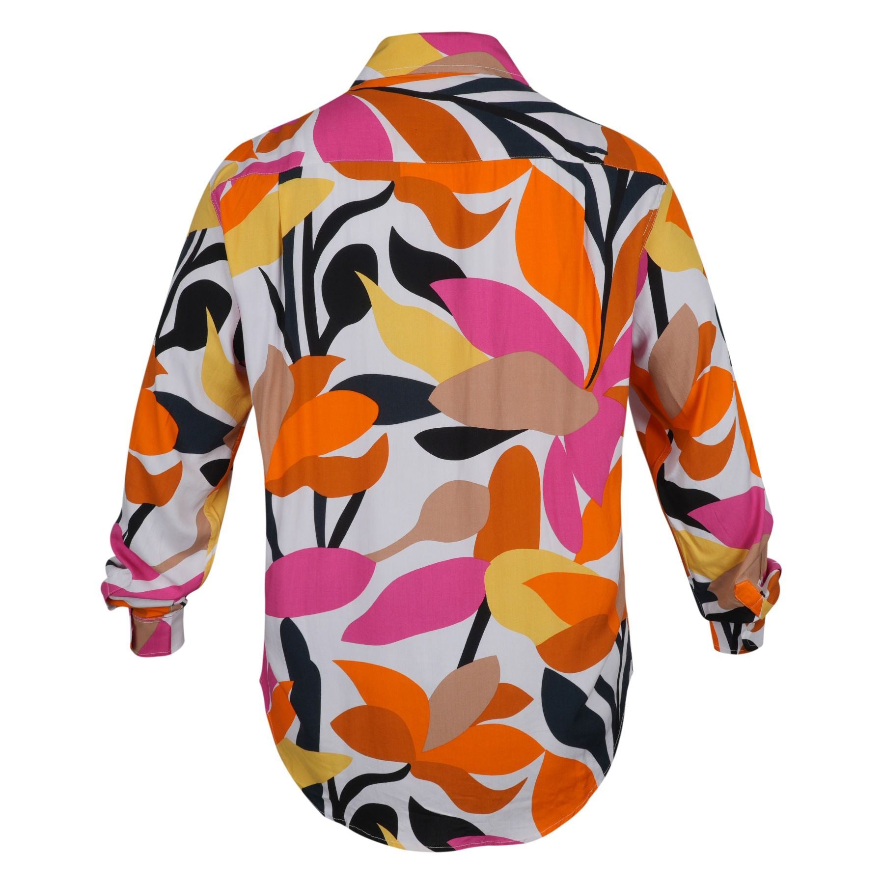 A lively mix of oversized tropical leaf shapes in pink, orange, yellow, and black creates a bright, modern summer look.