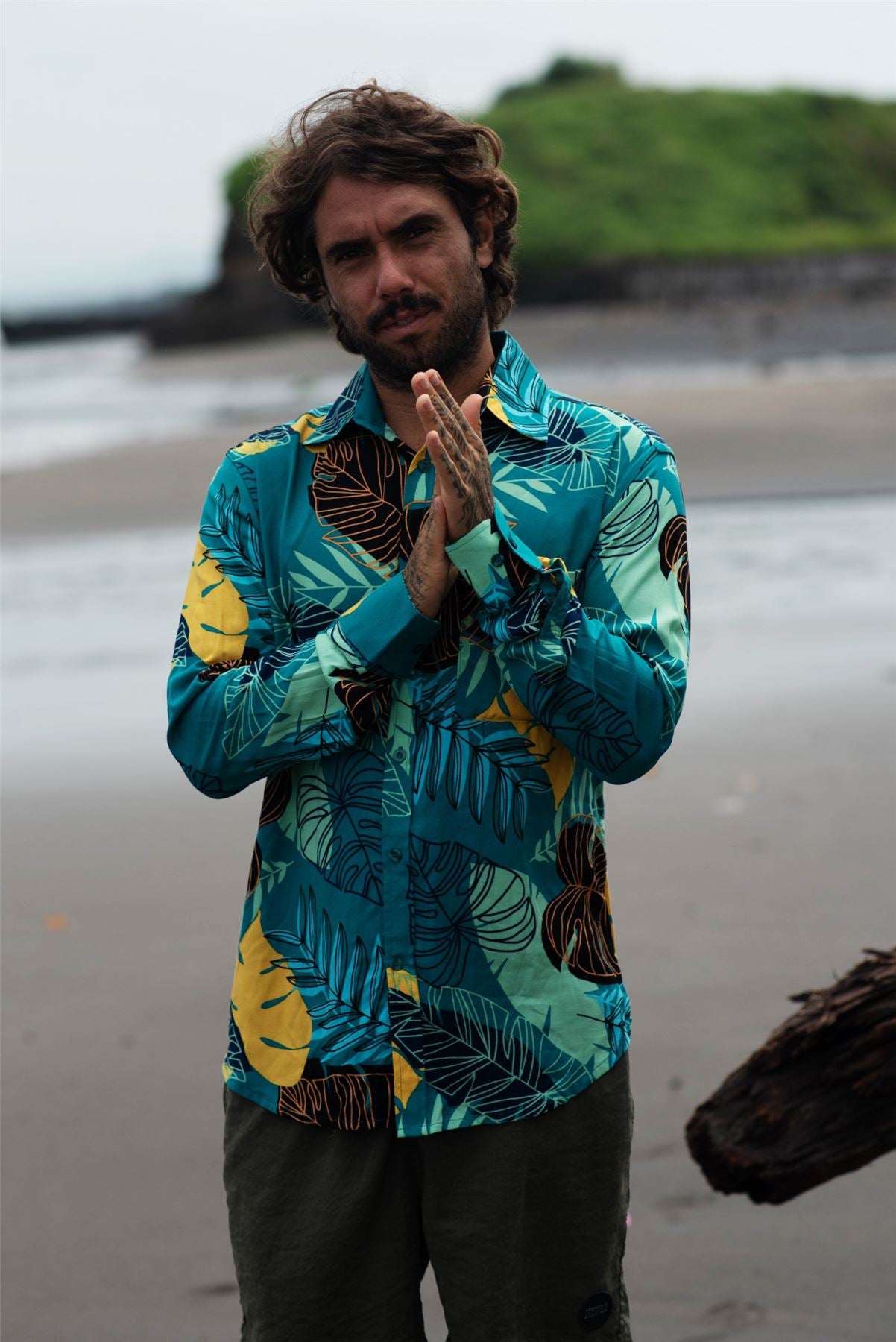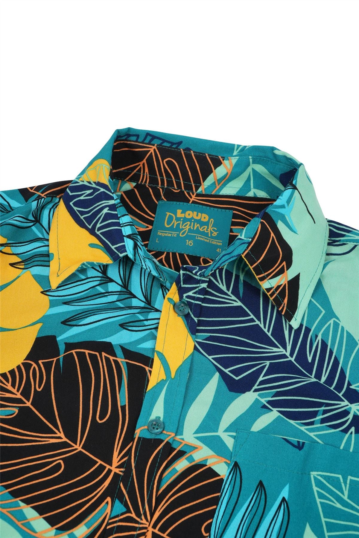 A fresh tropical leaf design blending teal, aqua, navy, and golden yellow tones for a vibrant coastal look.
