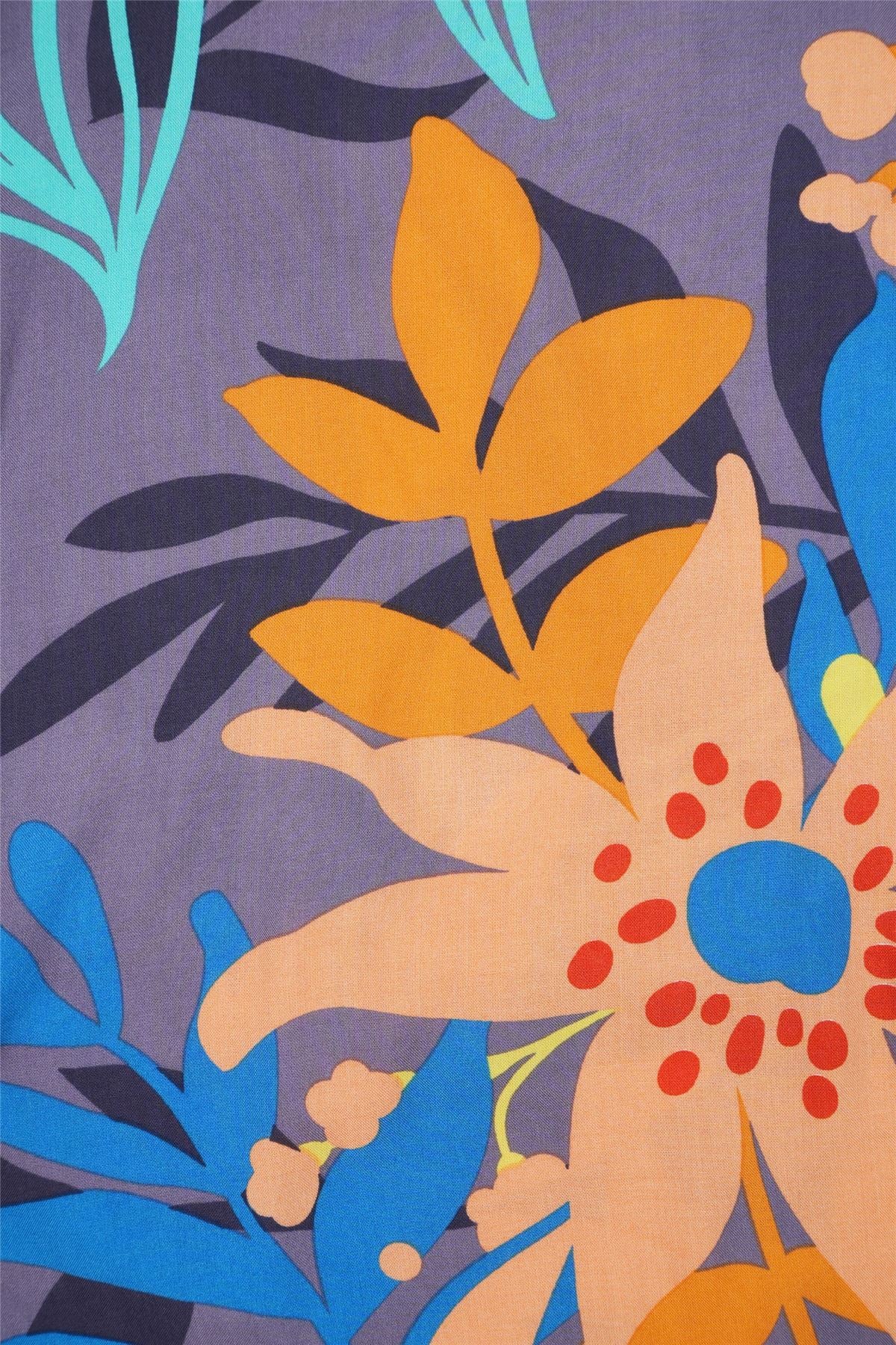 A bold floral design mixing warm orange tones with teal accents on a soft violet base for a rich, artistic tropical look.