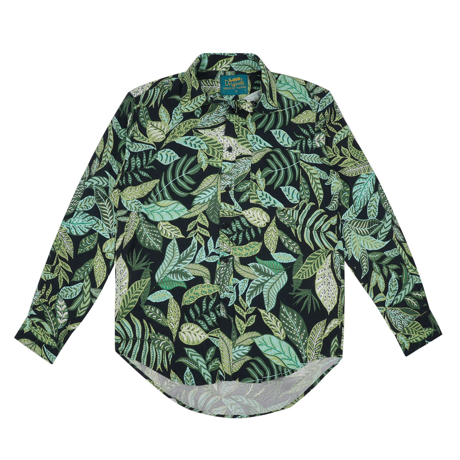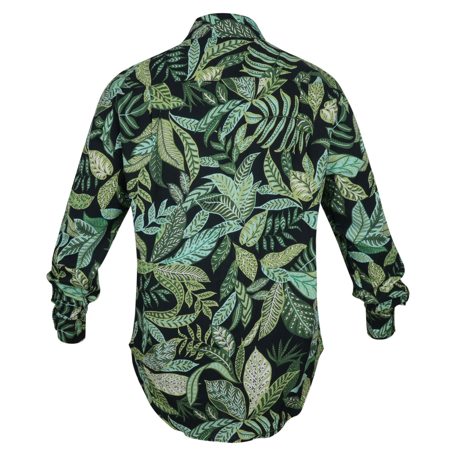 A lush layered leaf print in soft greens against deep black, creating a rich botanical forest look.