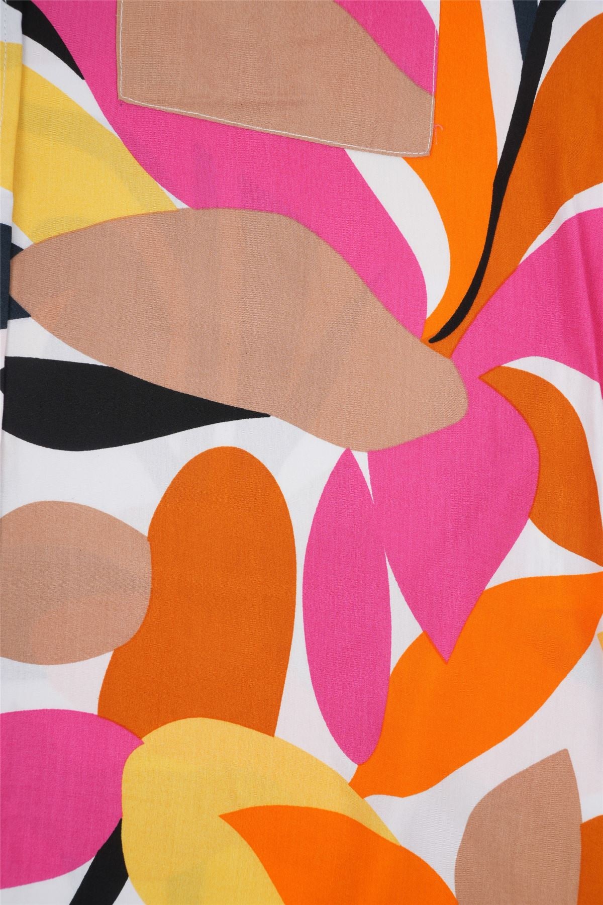A lively mix of oversized tropical leaf shapes in pink, orange, yellow, and black creates a bright, modern summer look.