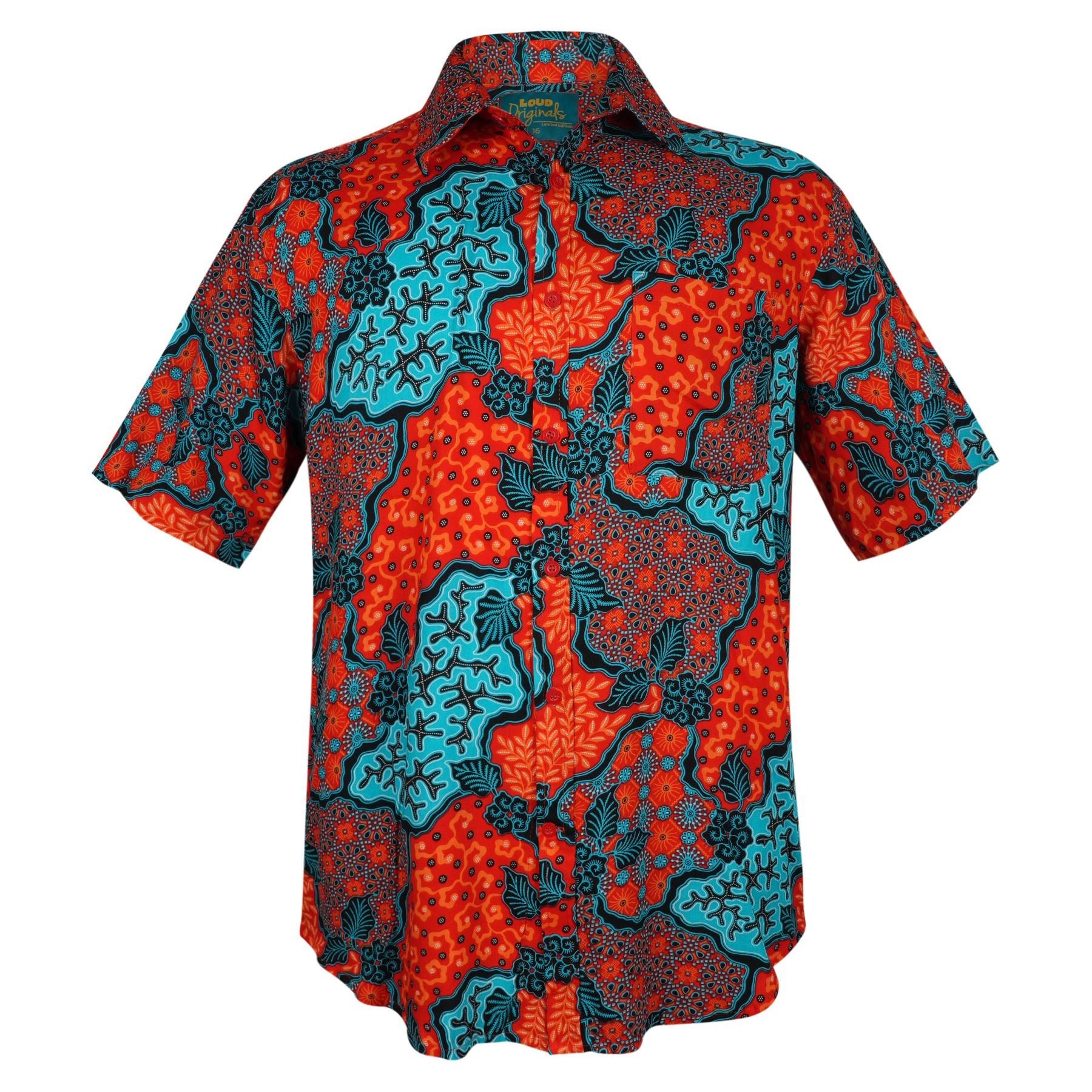 A striking mosaic of red and teal botanical shapes creates a bold, textured reef inspired pattern.