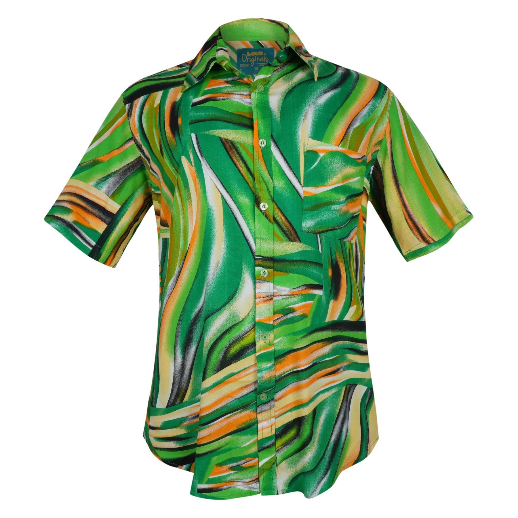 A bold abstract leaf inspired swirl of greens, yellows, and blacks that creates a dynamic jungle energy look.