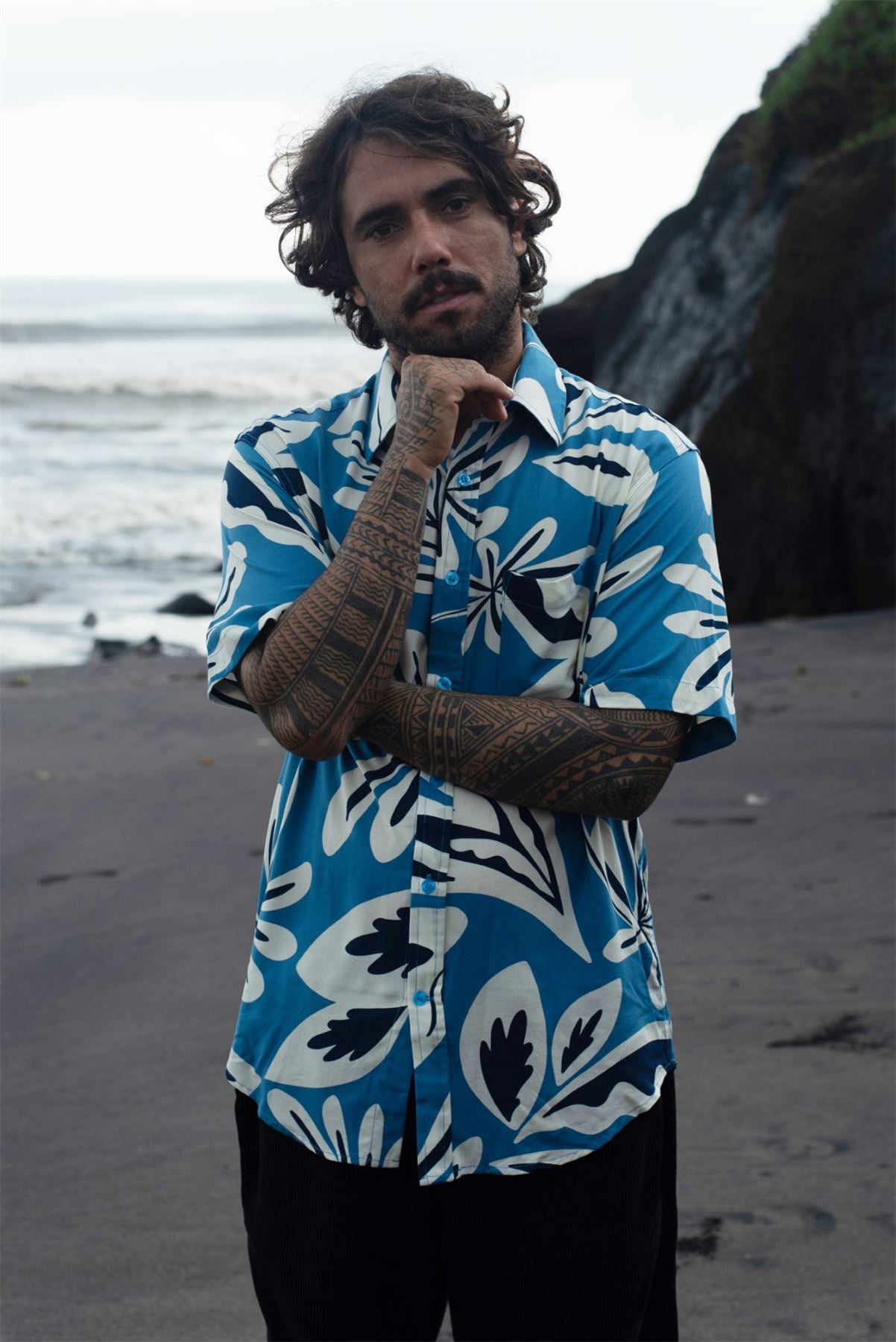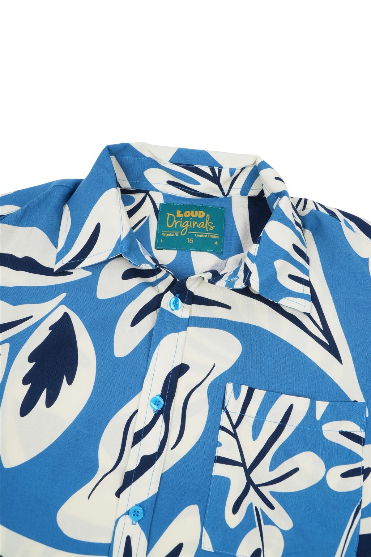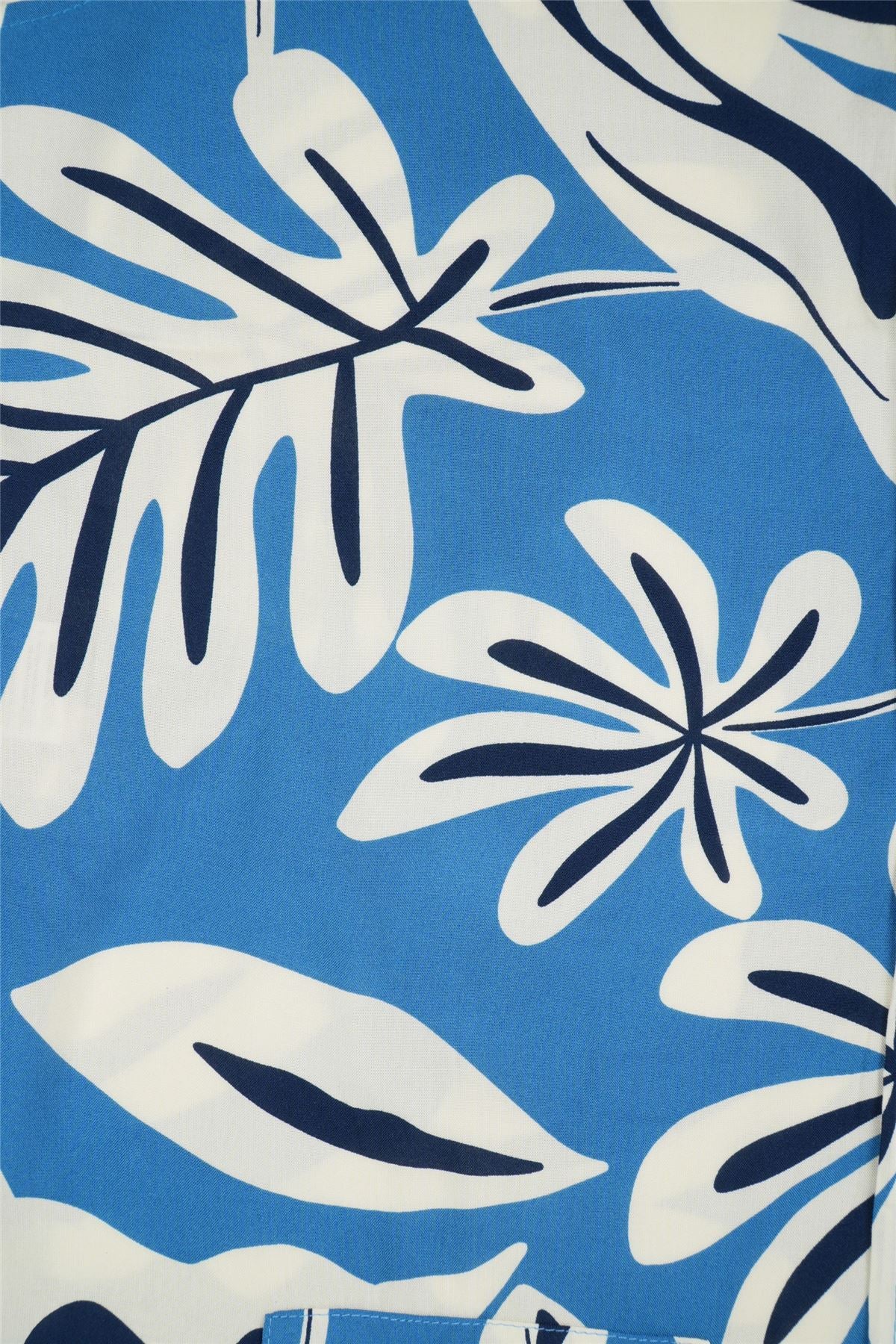 A bold blue and cream floral cutout pattern creates a clean, modern tropical look with strong coastal energy.