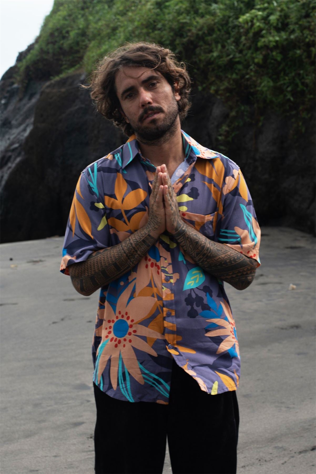 A bold floral design mixing warm orange tones with teal accents on a soft violet base for a rich, artistic tropical look.