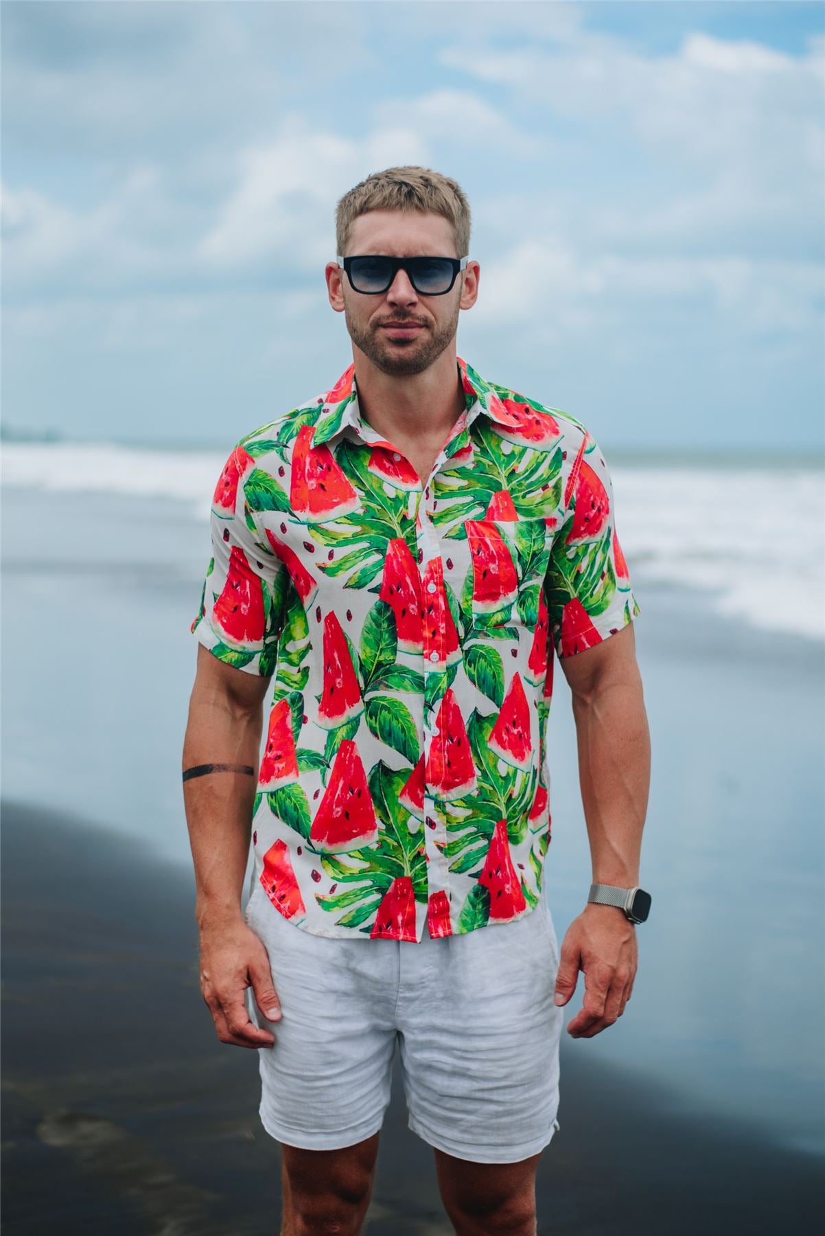 A vivid tropical design featuring bold watermelon slices and lush green leaves for an instant summer statement.
