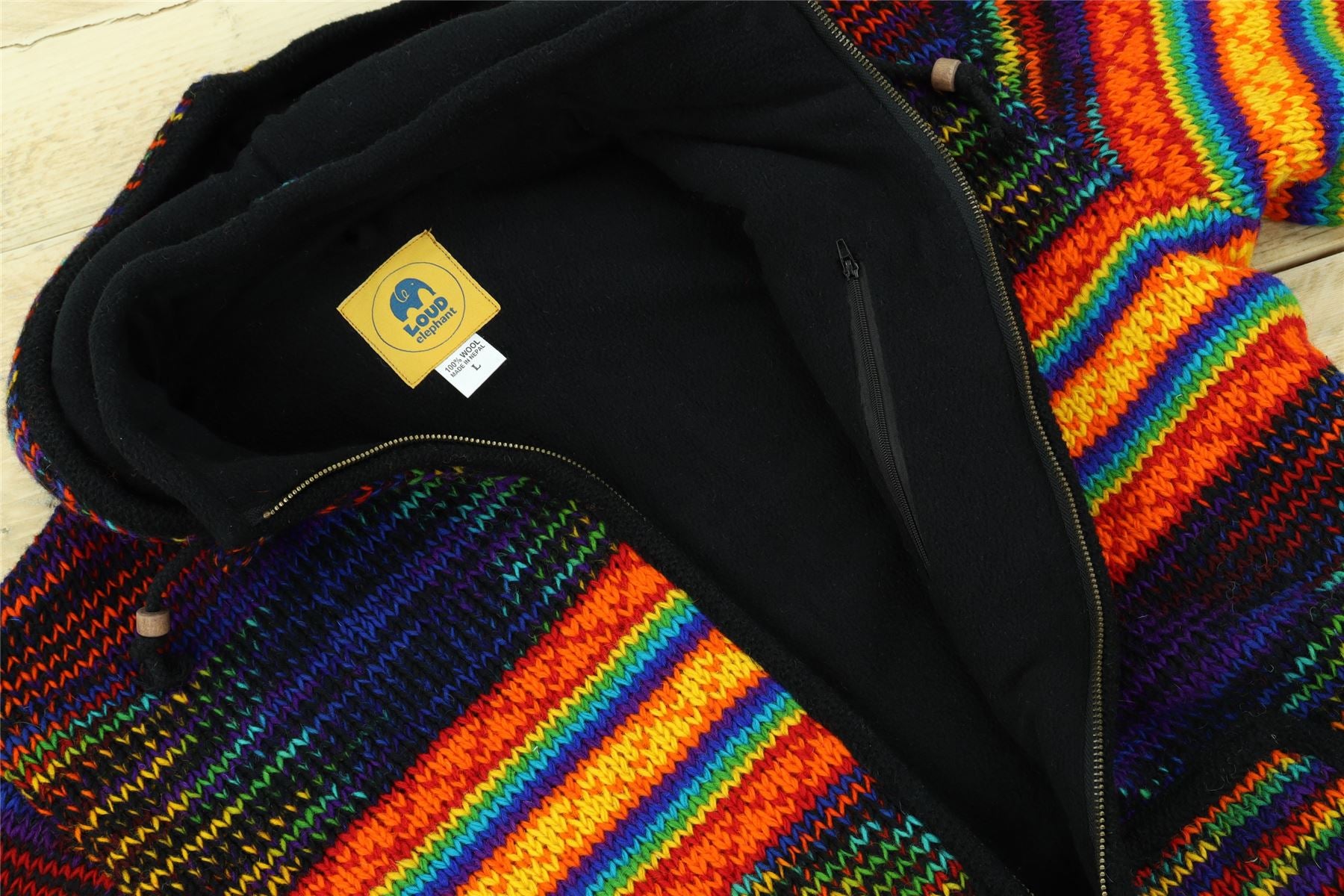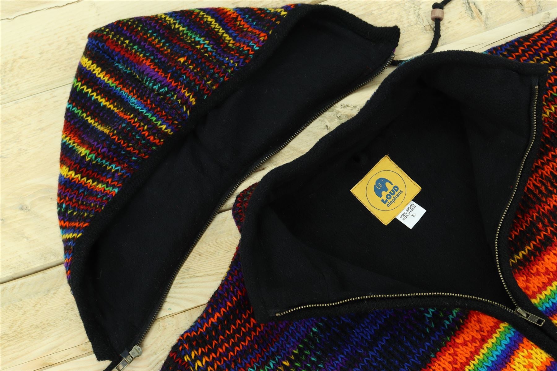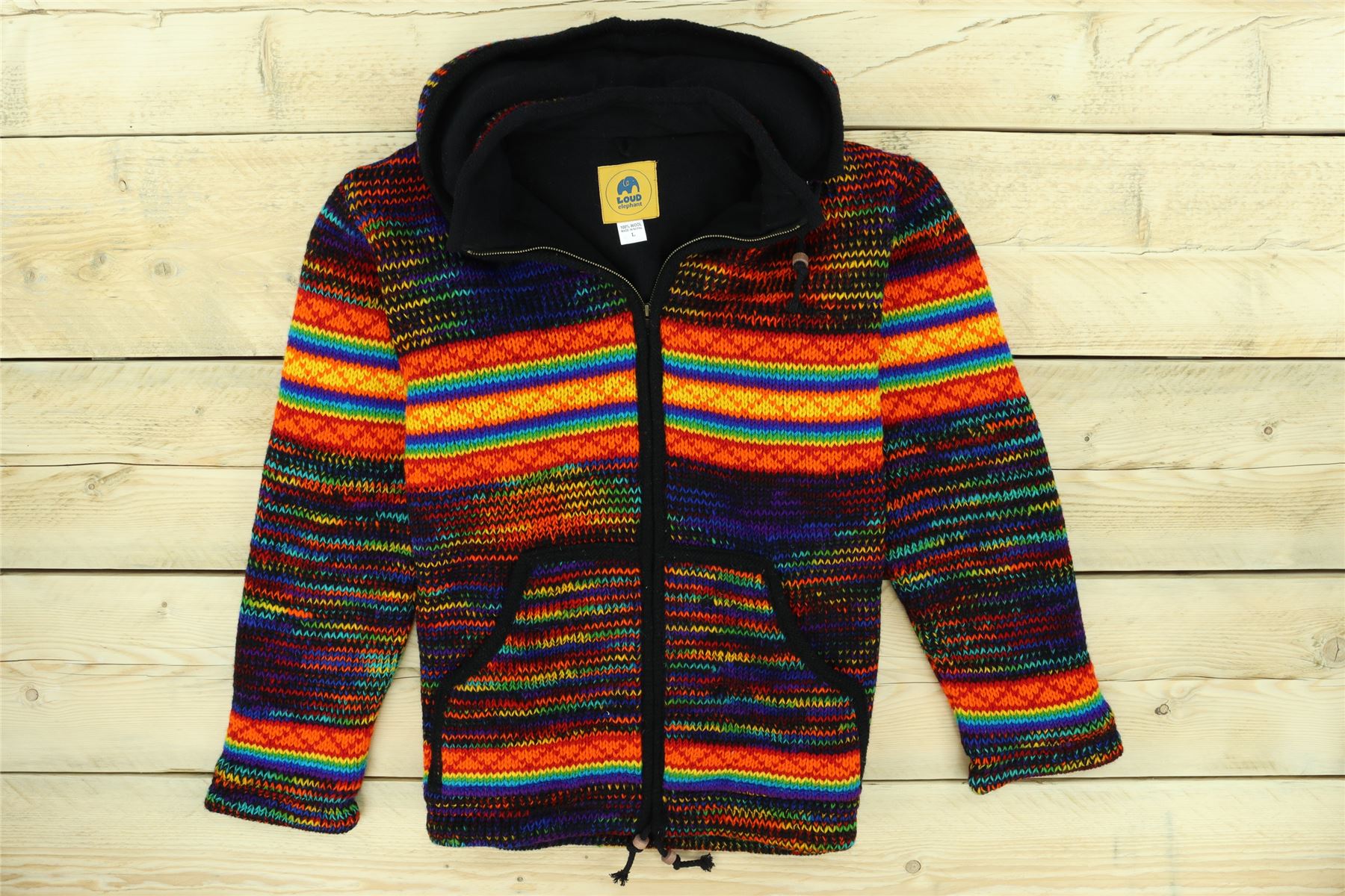 Handmade wool knit hooded zip jacket with a warm fleece lining, front pouch pocket, inside pocket, and a removeable zipped hood for a flexible look. A practical hoodie cardigan, great for laying up throughout the colder months and keeping warm around the fire during cool summer evenings.