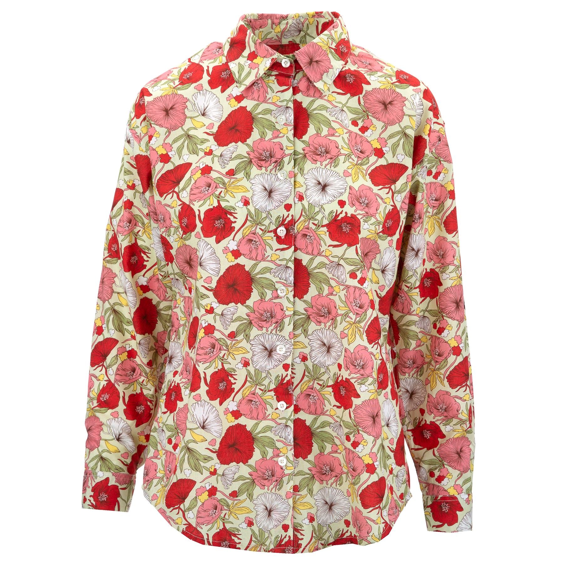 Our womens shirt has a buttoned front and cuffs with soft darts at the waist. One button at centre back of the collar. Can be worn loose or tucked in - a real head turner in vibrant prints.