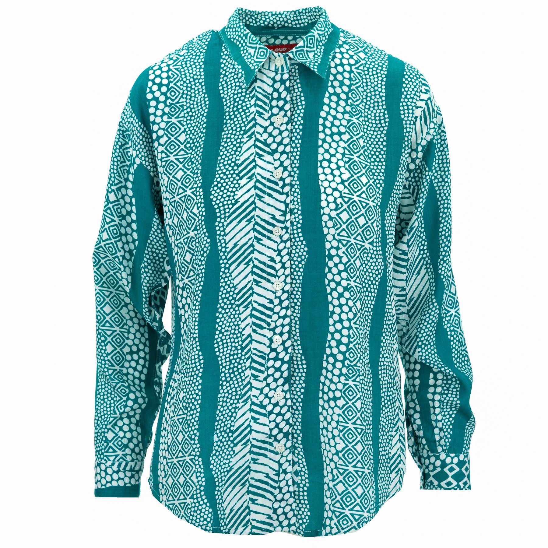 Our womens shirt has a buttoned front and cuffs with soft darts at the waist. One button at centre back of the collar. Can be worn loose or tucked in - a real head turner in vibrant prints.