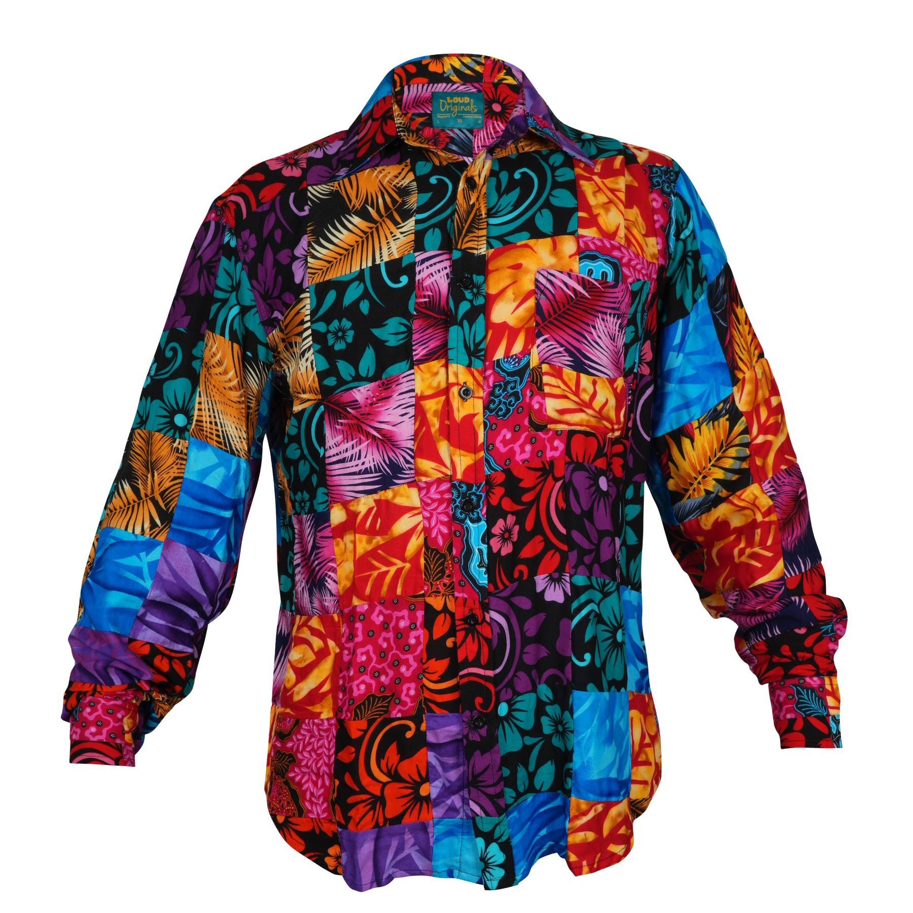 A vibrant patchwork style print blending bold tropical florals and abstract motifs in a rich spectrum of summery colours.
