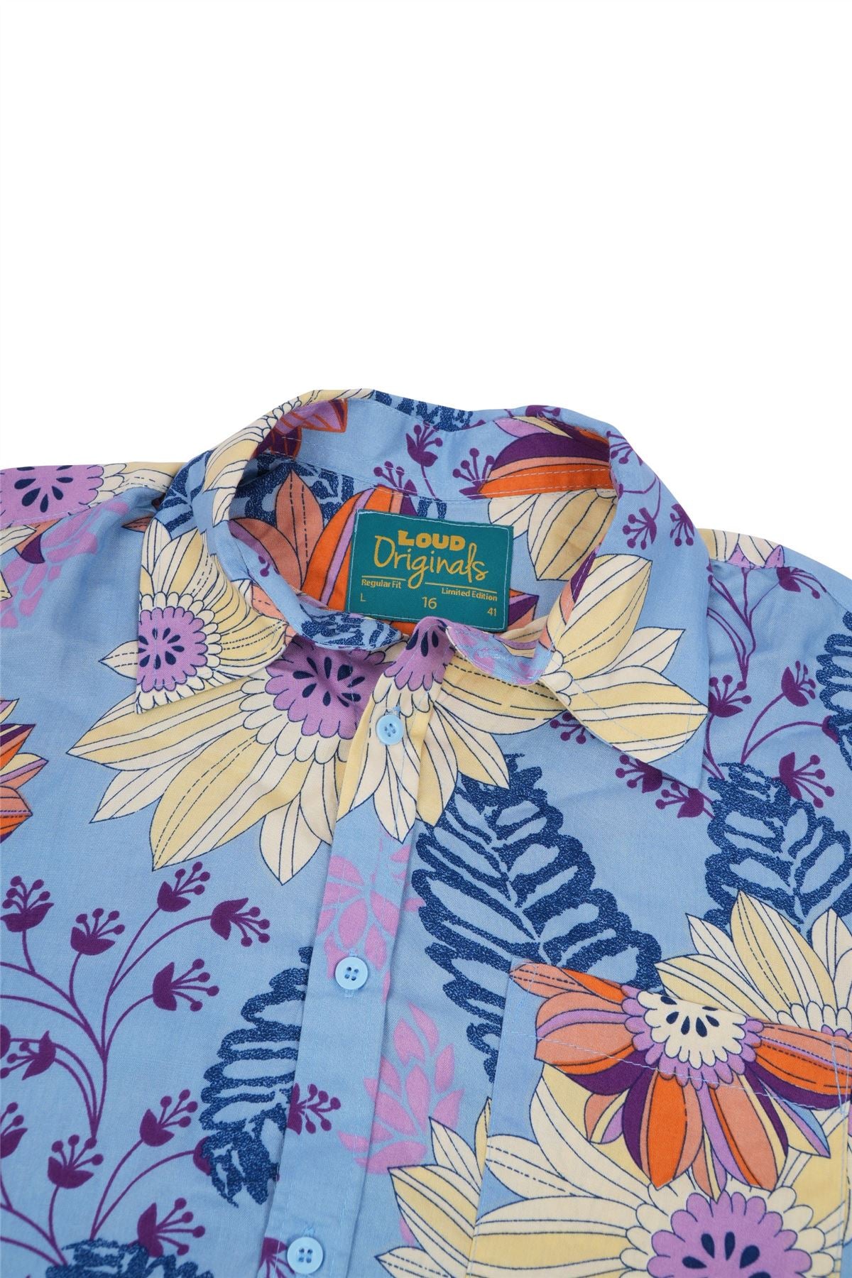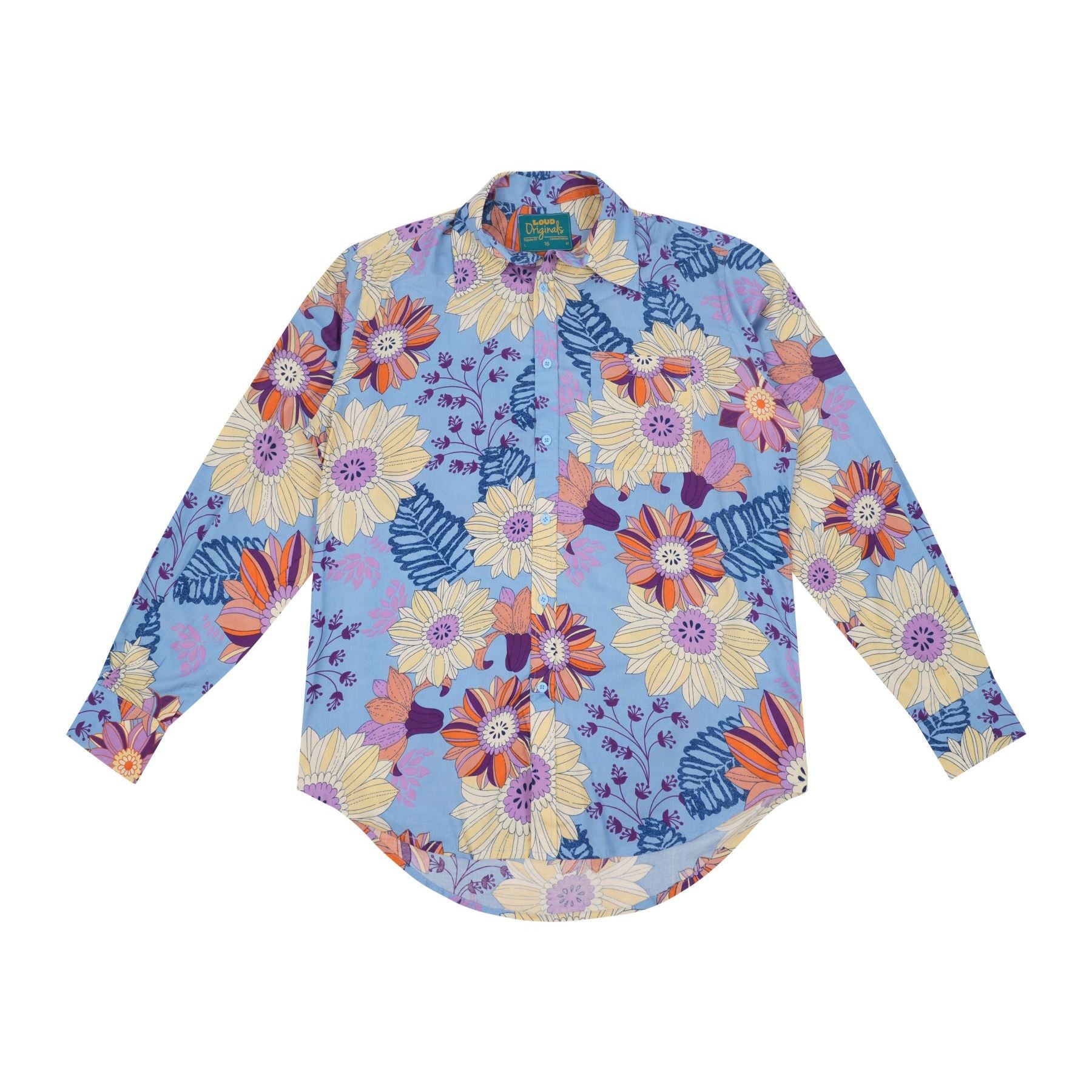 A soft blue floral print bursting with warm sunflower tones and leafy contrasts for a bright, easygoing look.