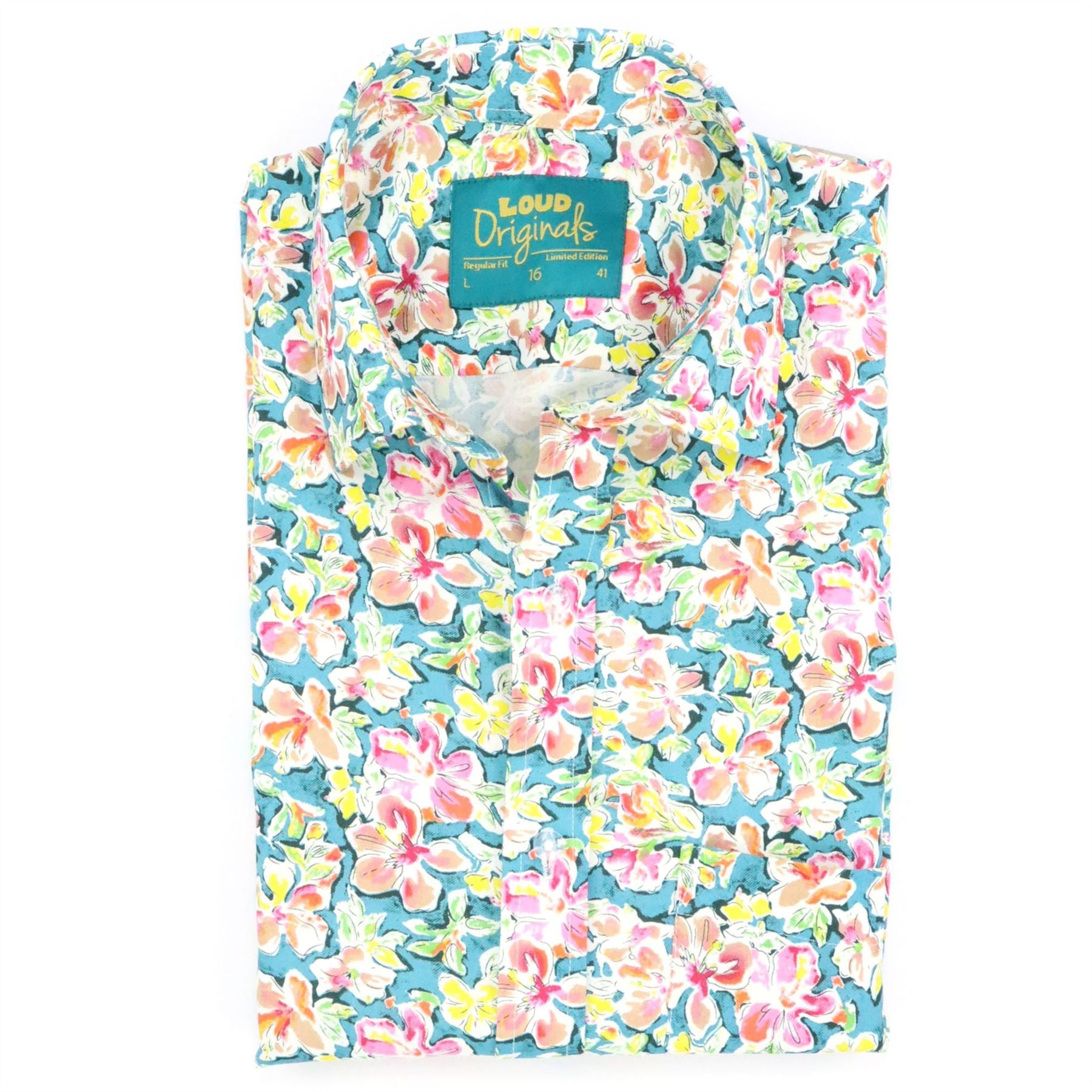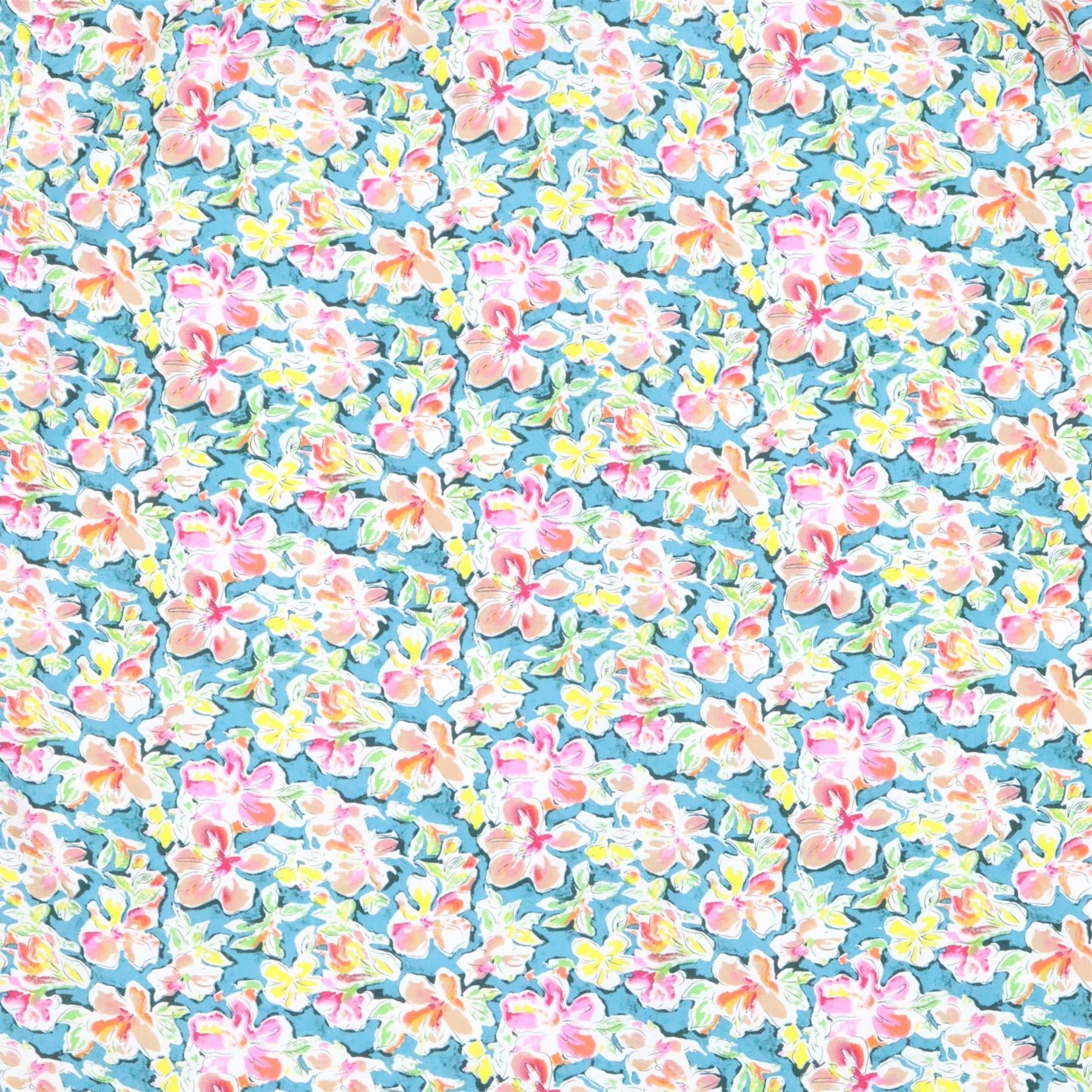 A dense carpet of small pink and yellow flowers covers a bright turquoise background for a cheerful ditsy print.