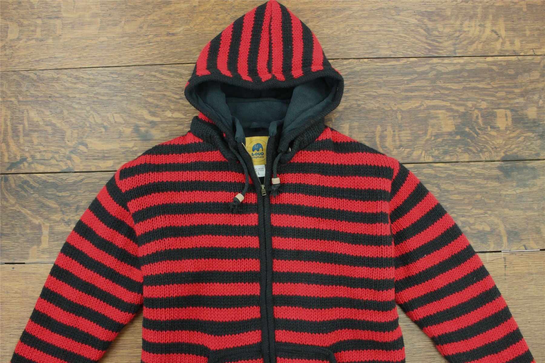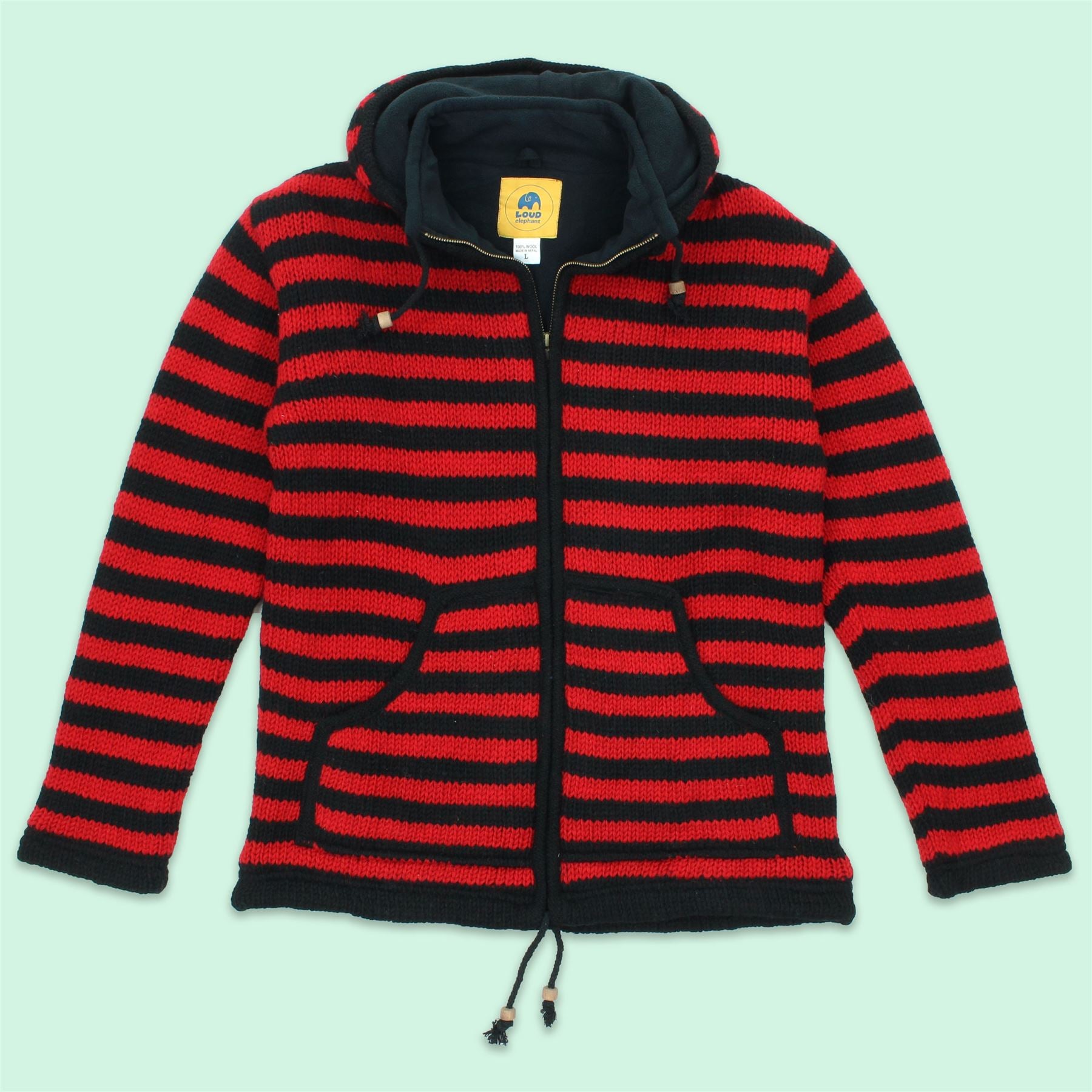 Hand Knitted Wool Hooded Jacket Cardigan - Stripe Red Black