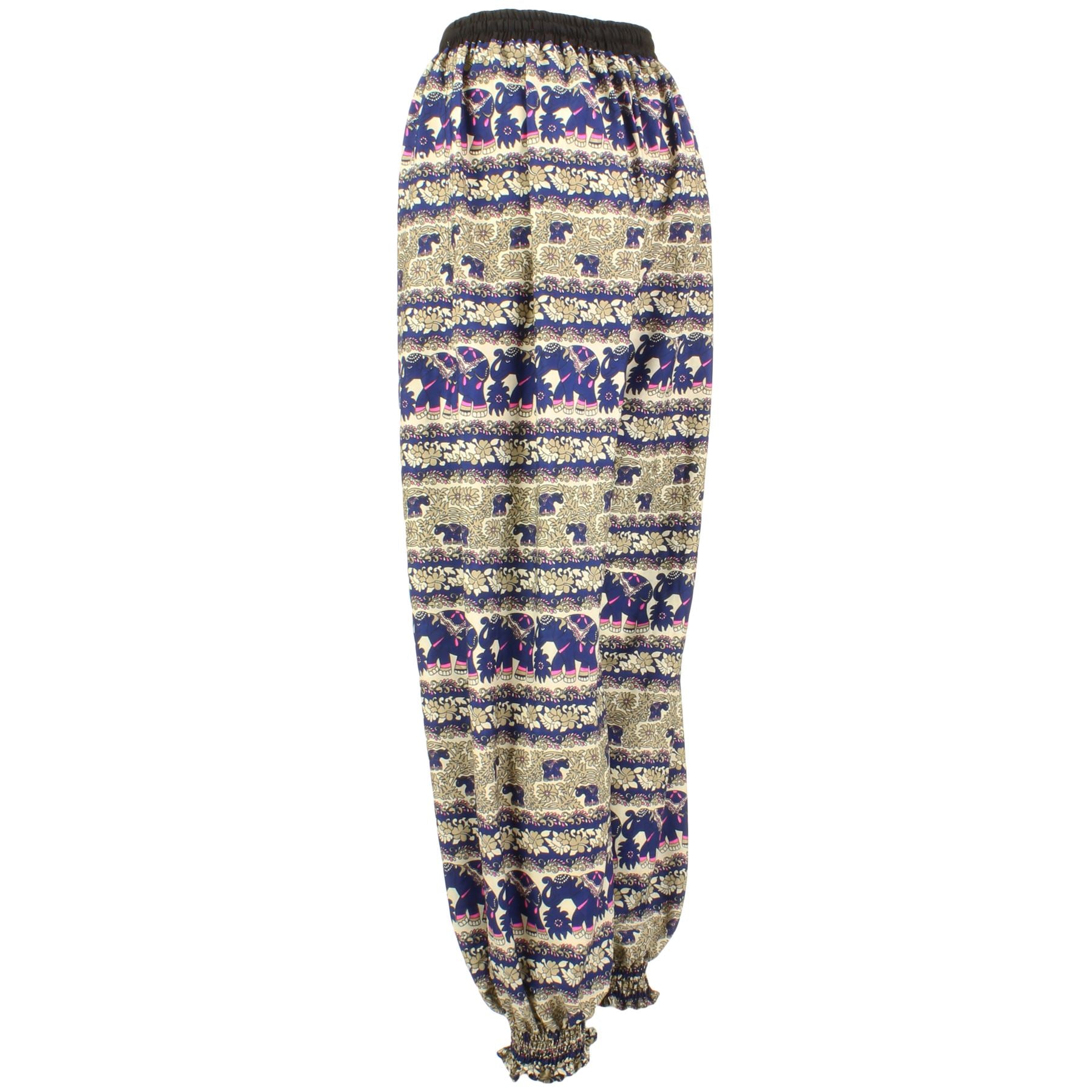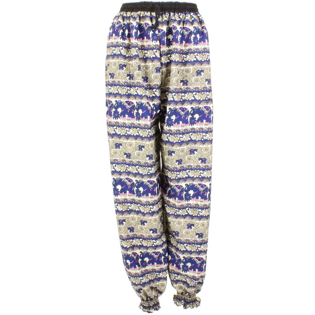 Blue & Beige Floral elephant print Harem Ali Baba trousers featuring side pockets and elasticated waist and ankles.