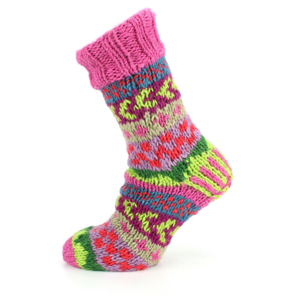 Handmade chunky wool knit slipper socks with a full fleece lining for warmth. These lovely socks are perfect for slouching around the house, they'll be sure to keep you warm and cosy. Available in lovely colours and designs, including striped and Space Dye.