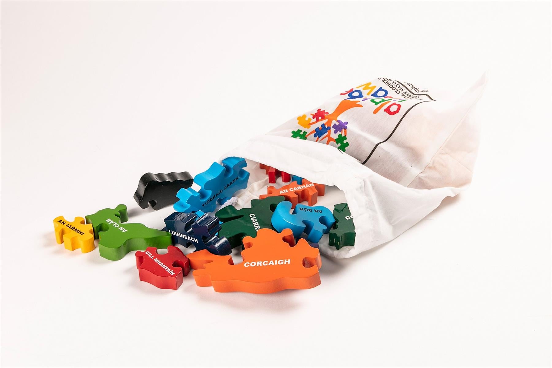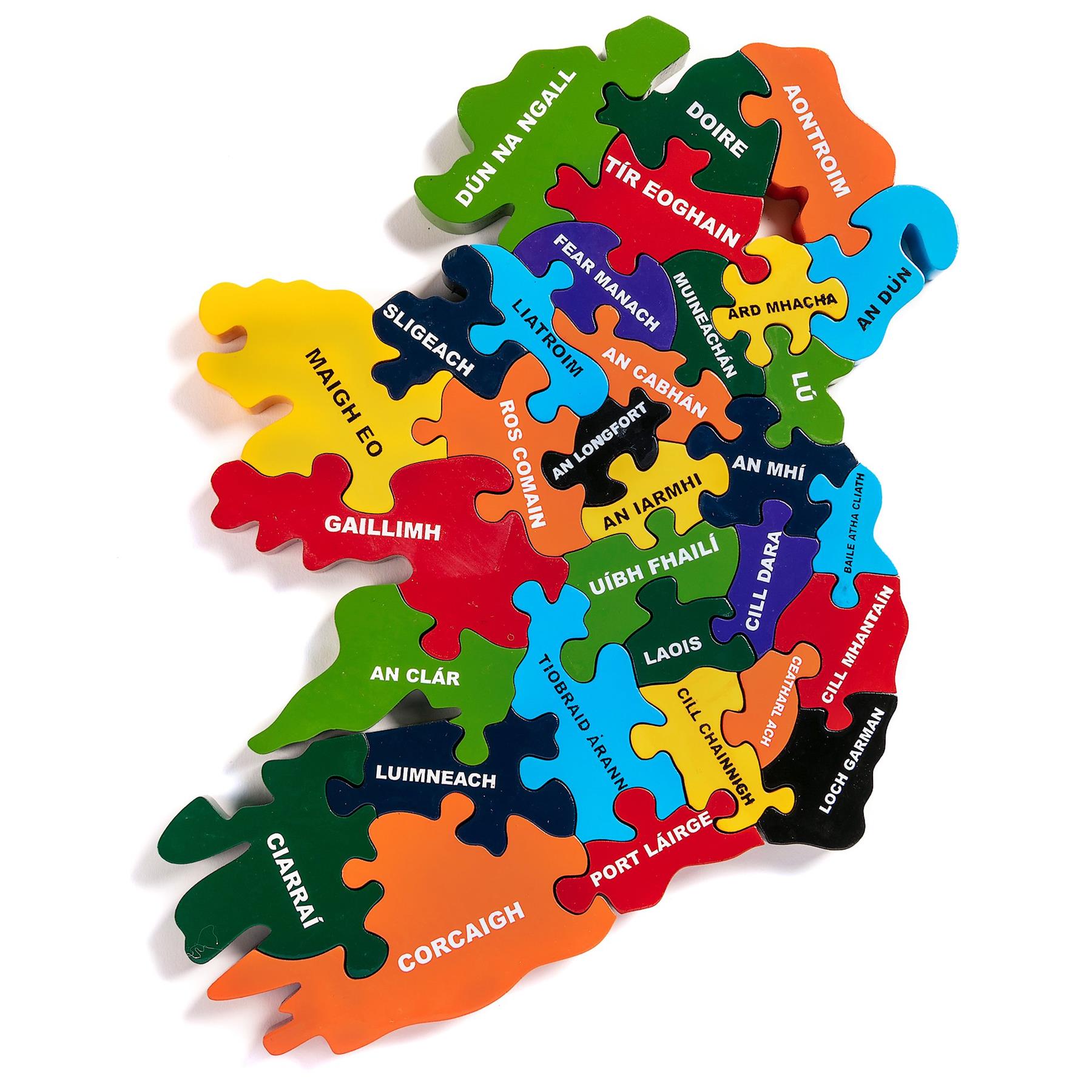 Our Map of Ireland jigsaw puzzle, as Gaeilge, is a brilliant challenge for young and old alike. All 32 counties of Ireland are represented as separate interlocking wooden pieces with the name of each county written in Irish.